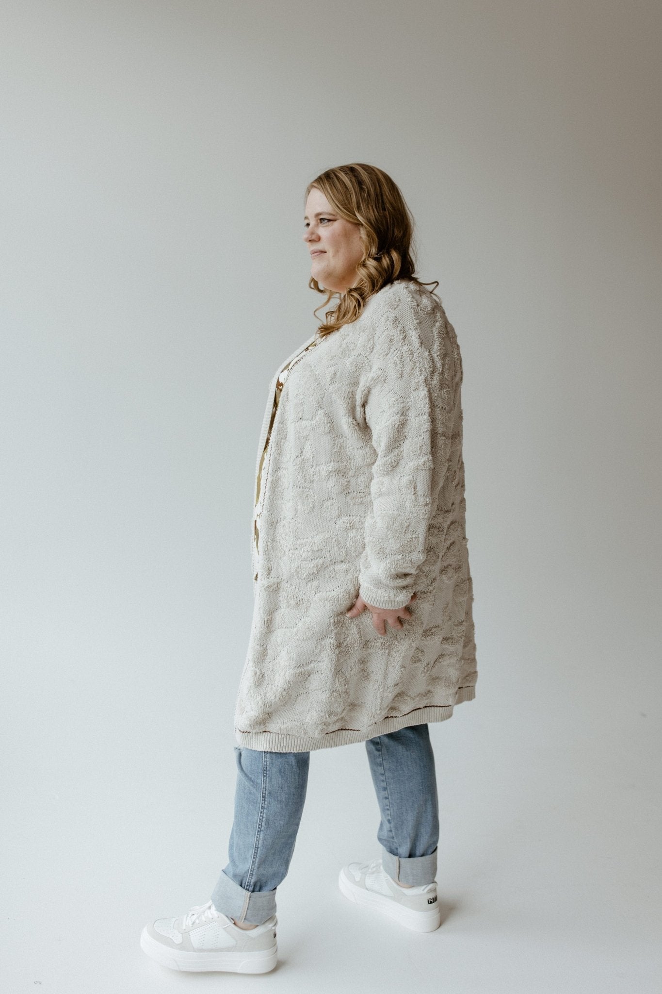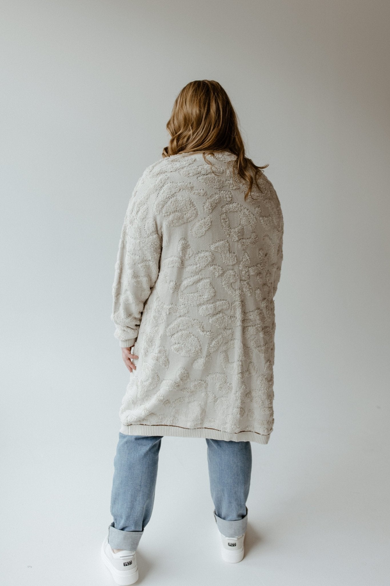 Have you been looking for the latest trend in animal print? Well, wait no further; this tone-on-tone animal print is the way to go! You'll elevate any outfit with this cozy duster cardigan! Throw it on for work, a casual weekend, or a date night! It has an open front that is edged in a great warm brown sparkle stitching along with the hem and cuffs of the sleeves. The edging emphasizes the duster length and the cardigan is in a luxurious fuzzy-faux fur-like fabric! Did we mention it is oh-so-soft?! Fits true to size.