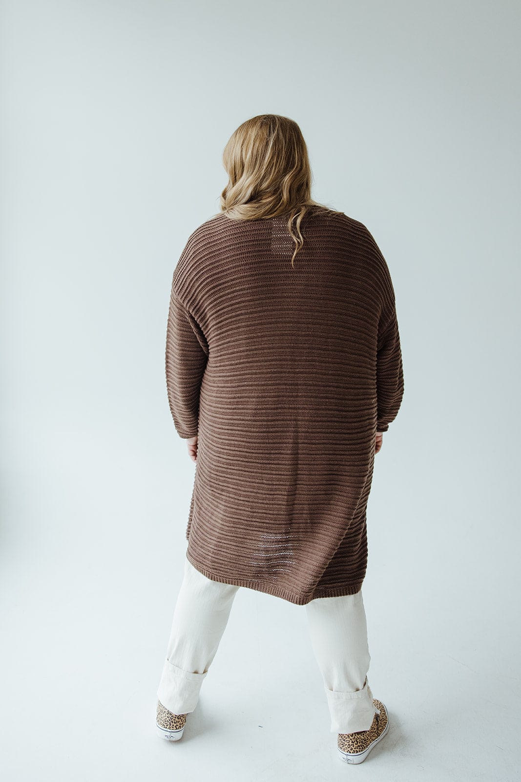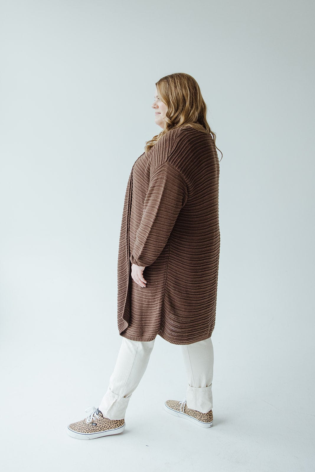 You'll feel enveloped in style, sophistication, and understated elegance in this luxurious knit cardigan. This exquisite cardigan is the epitome of less is more, and when it is made out of quality fabrics and sound design, the less there is, the more it makes a statement. We haven't even gotten to the breathtaking rich, stunning ganache color yet! You're going to love all of the little details that make a statement! Like the subtle stripe pattern in the knitting, the open front, and the small little cuff and hem. the wide cuff sleeve on the sculpted blouson sleeves, and the tunic length hits at the perfect length that will land around midthigh. The amazing yarn will skim curves! Fits true to size.