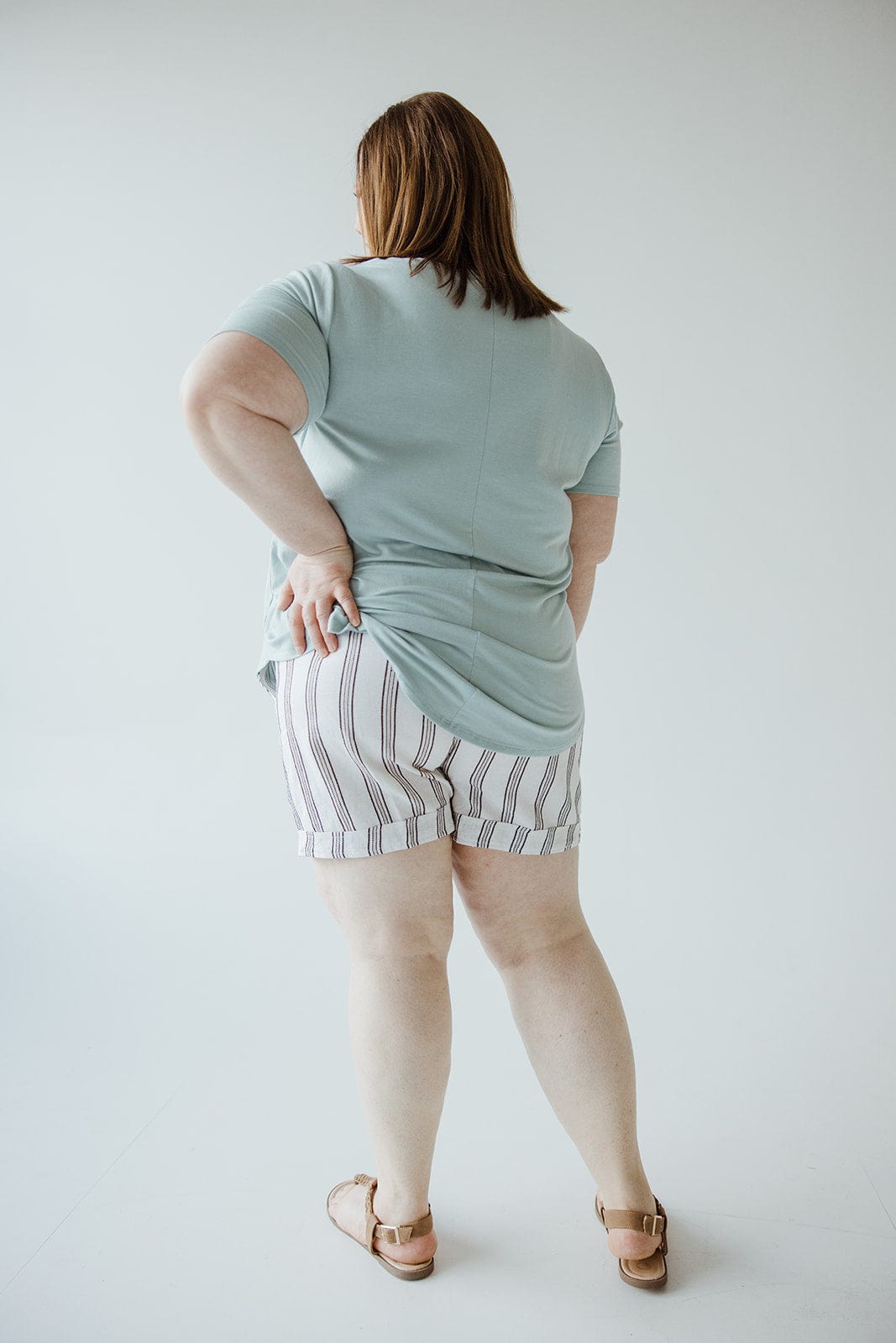 These classic STRIPED LINEN SHORTS offer the perfect balance of style and comfort. Crafted from lightweight linen, with cargo style pockets, a front tie and an elastic waistband for added security and ease of movement, they are perfect for any outfit, whether you're heading out or staying in. The 5" inseam and 13" rise ensure a flattering fit, with a cuffed leg opening of 30" for an airy, summery feel. Fits true to size. Have little to no stretch. Stacey is wearing a size 2x. Want more information about the model? Visit our Lovely Models page.