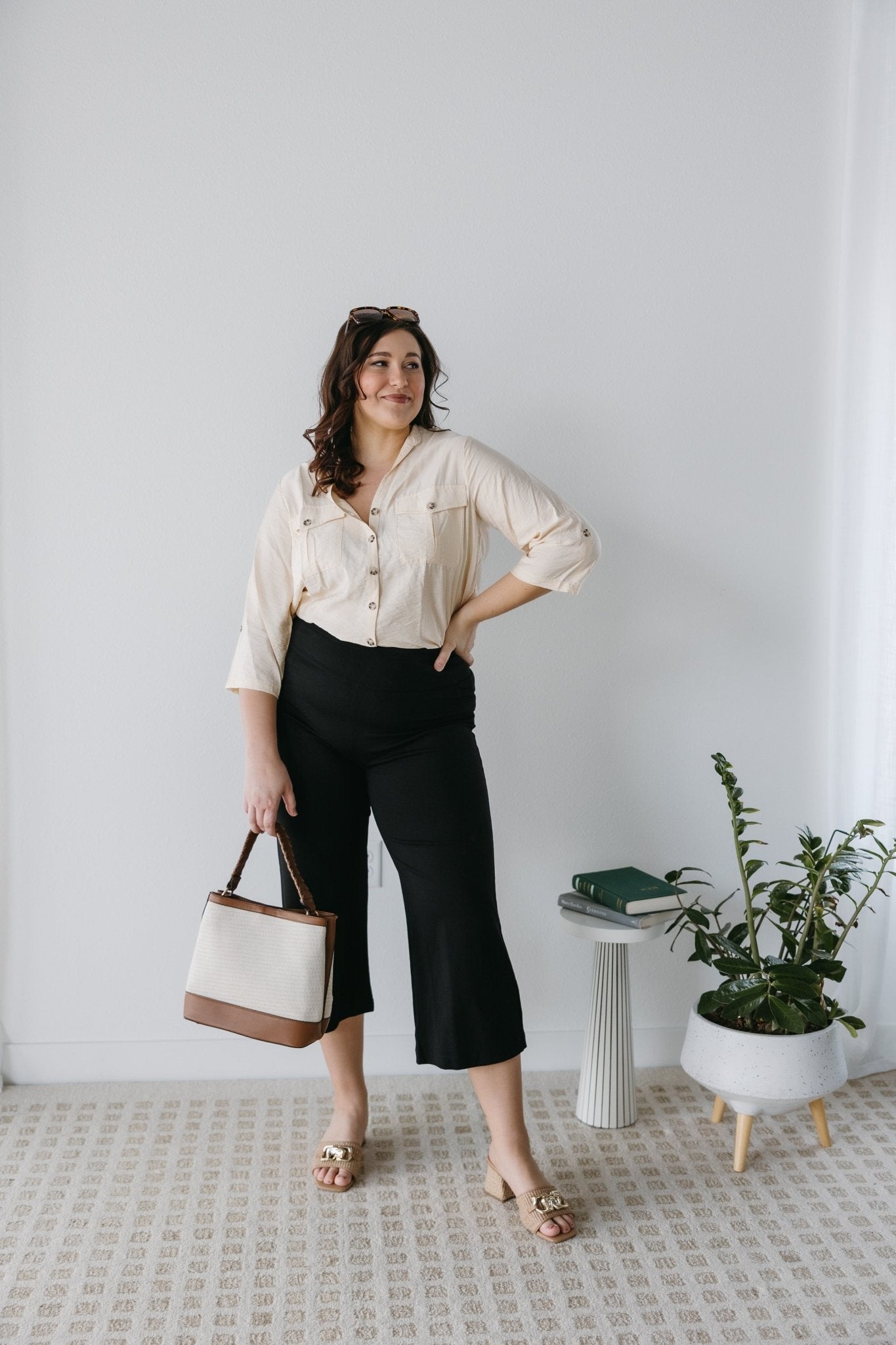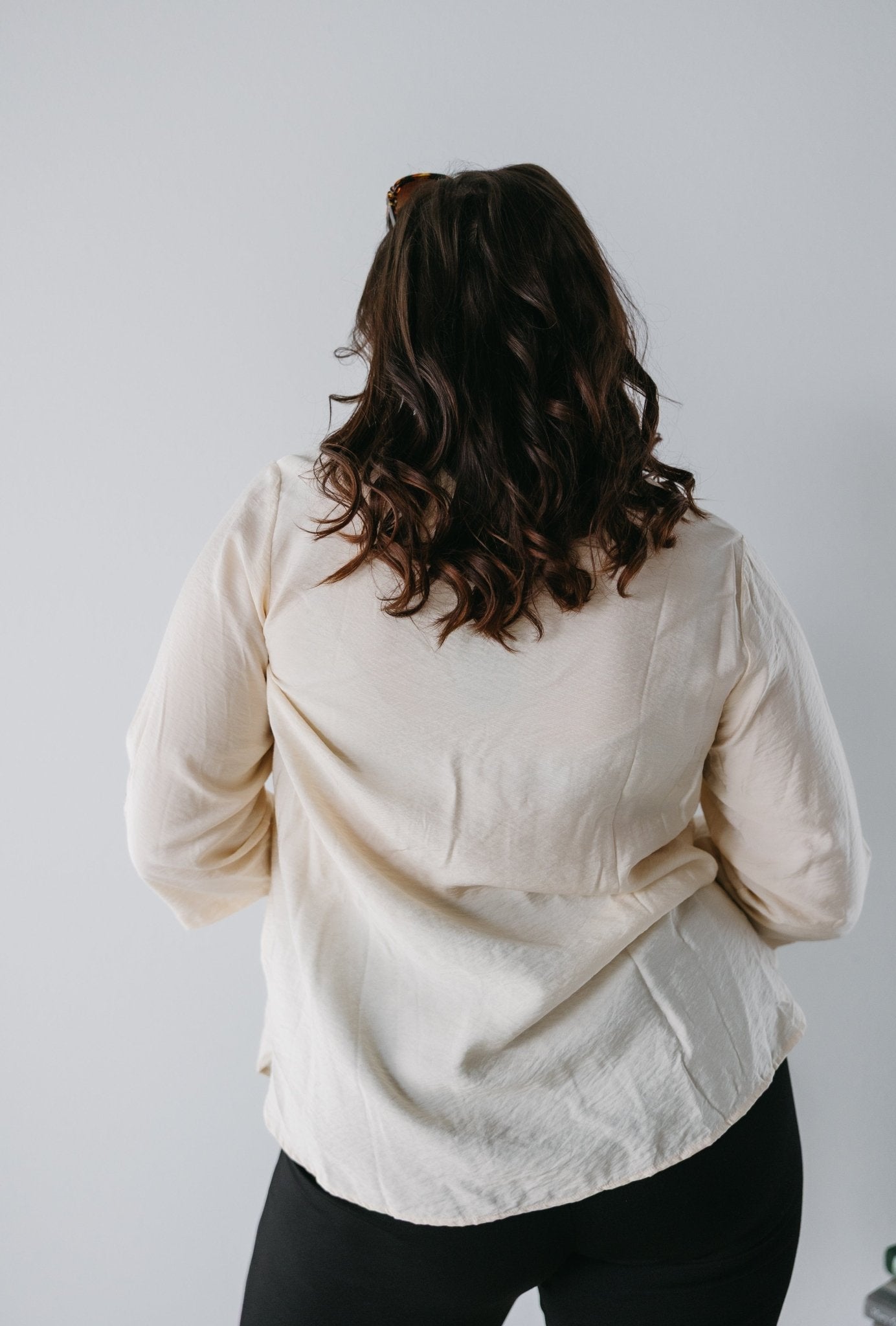 Effortlessly refined and endlessly versatile, our Button Down Blouse in Bleached Driftwood is the ultimate layering piece. Made from a lightweight, textured fabric that feels luxurious against the skin, this blouse features ruched 3/4 sleeves with button detailing, a crisp mandarin collar, and subtly stitched chest pockets that add just the right amount of structure. The soft neutral shade—an airy blend of beige and gray—makes it a go-to option for both casual and work-ready looks. Style it under cardigans, wear it open over a tank, or tuck it into trousers for elevated ease.