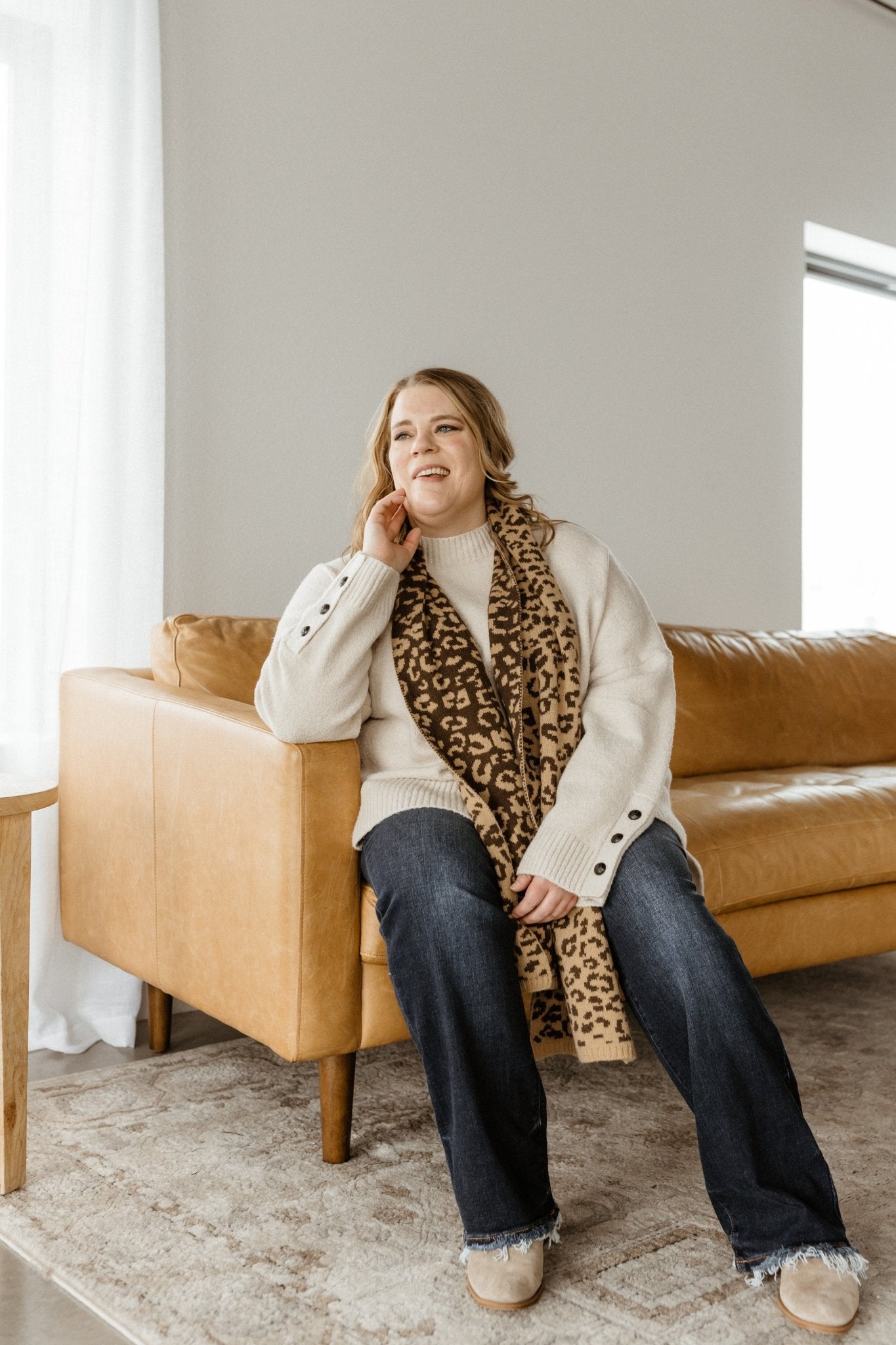 A cozy, soft scarf in classic animal print. What more can a girl ask for? This scarf is ultra-soft in a great knit fabric! Fun ribbed trim. This is the perfect cold-weather accessory! Not bulky! The classic neutrals add sophistication to a fun print! Add a sassy pop to any winter coat!