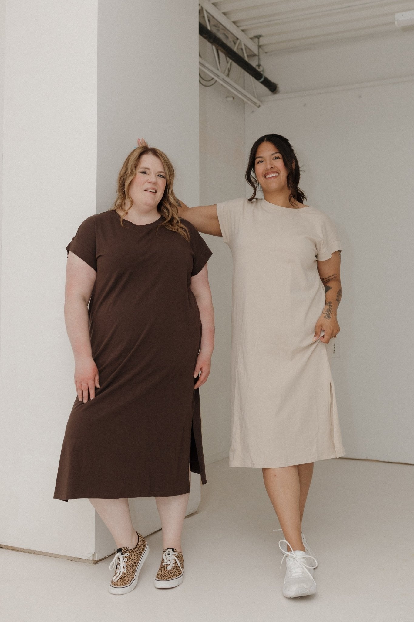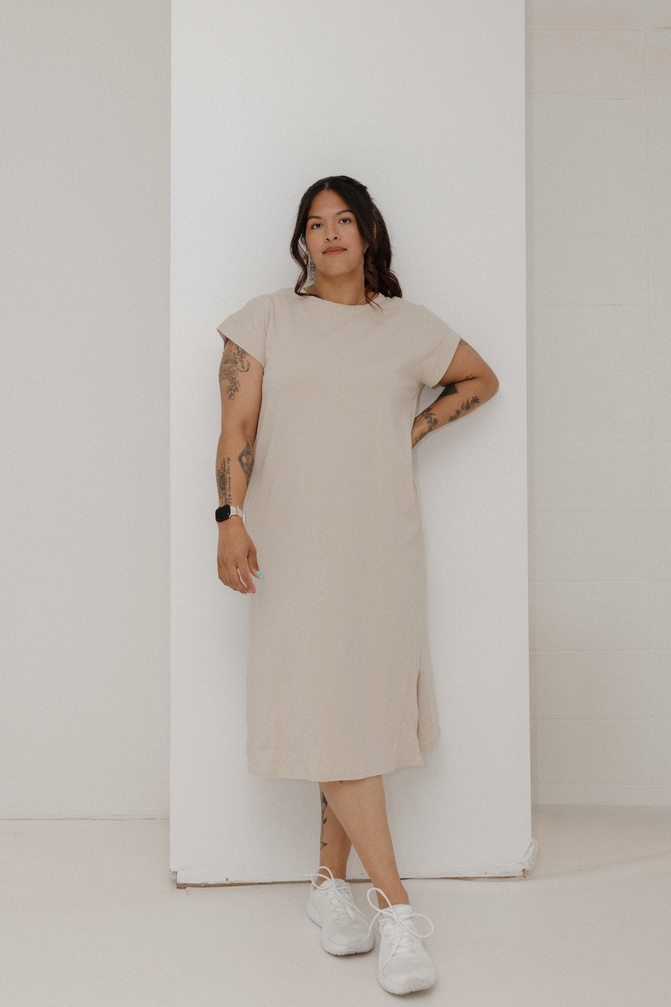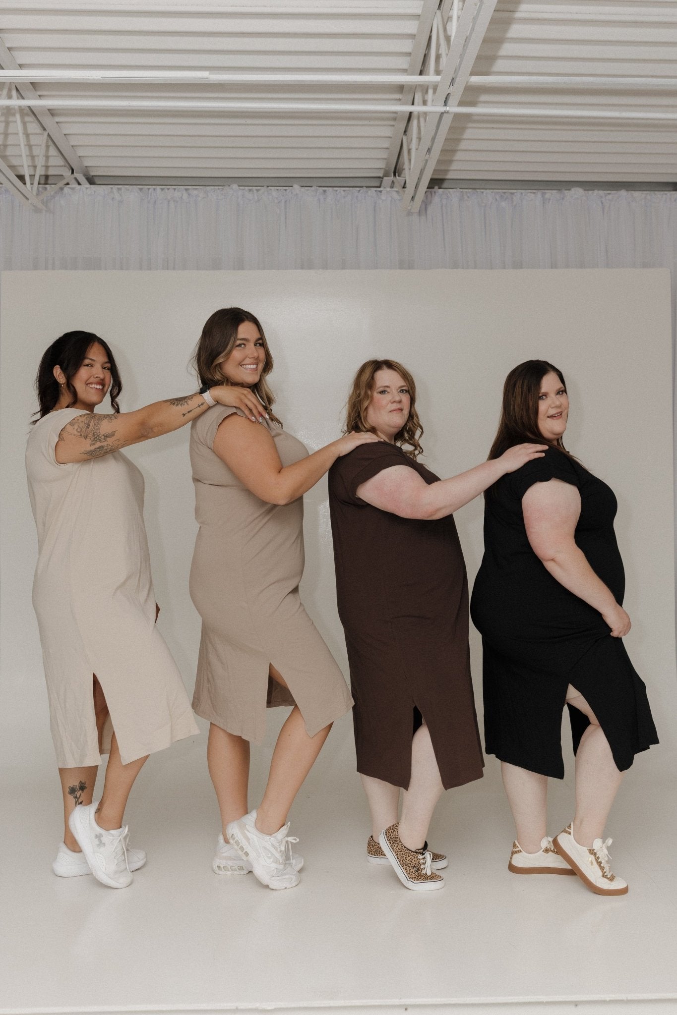 Meet your new go-to staple—the Crew Neck Midi Dress with Side Slit in Sand, a modern t-shirt dress designed for comfort, confidence, and everyday style. Crafted from soft, breathable fabric that drapes beautifully over your curves, this dress offers an effortless silhouette you’ll reach for again and again.