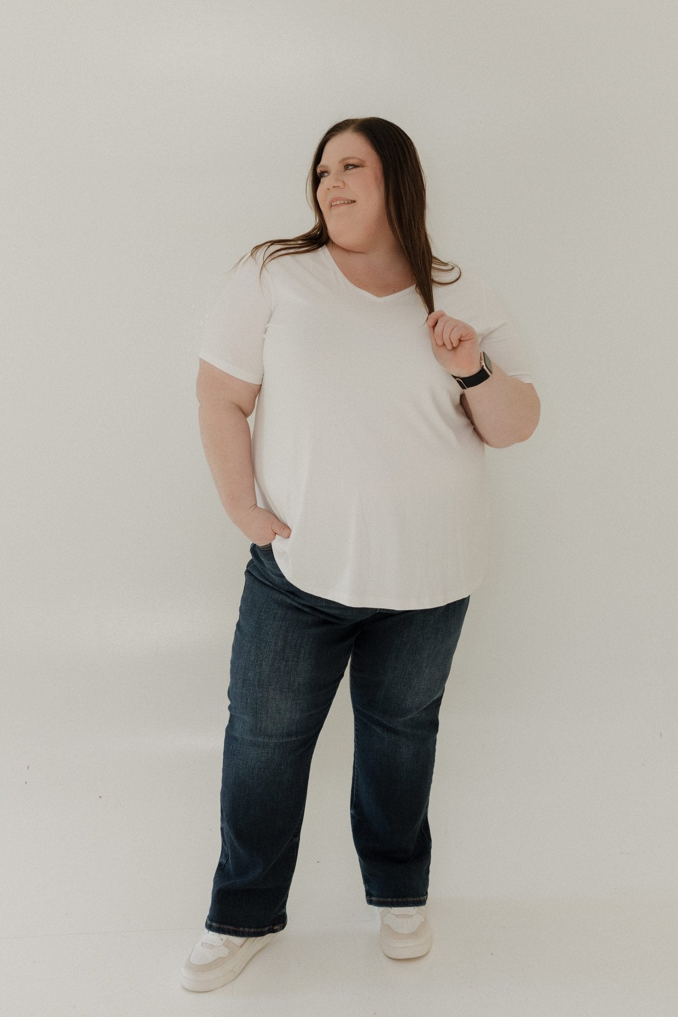 The mid-rise waist offers secure, flattering support, while the classic straight-leg silhouette pairs effortlessly with everything from cozy sweaters to polished blazers. Designed with mid-size and plus-size petites in mind, these jeans are a true everyday staple you’ll reach for again and again.