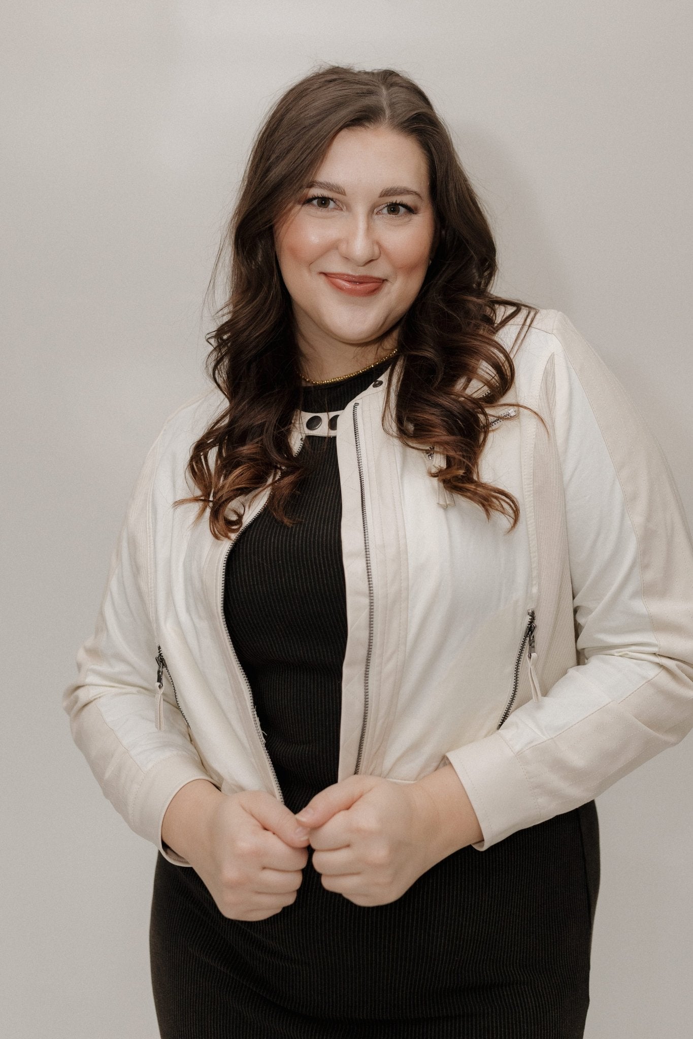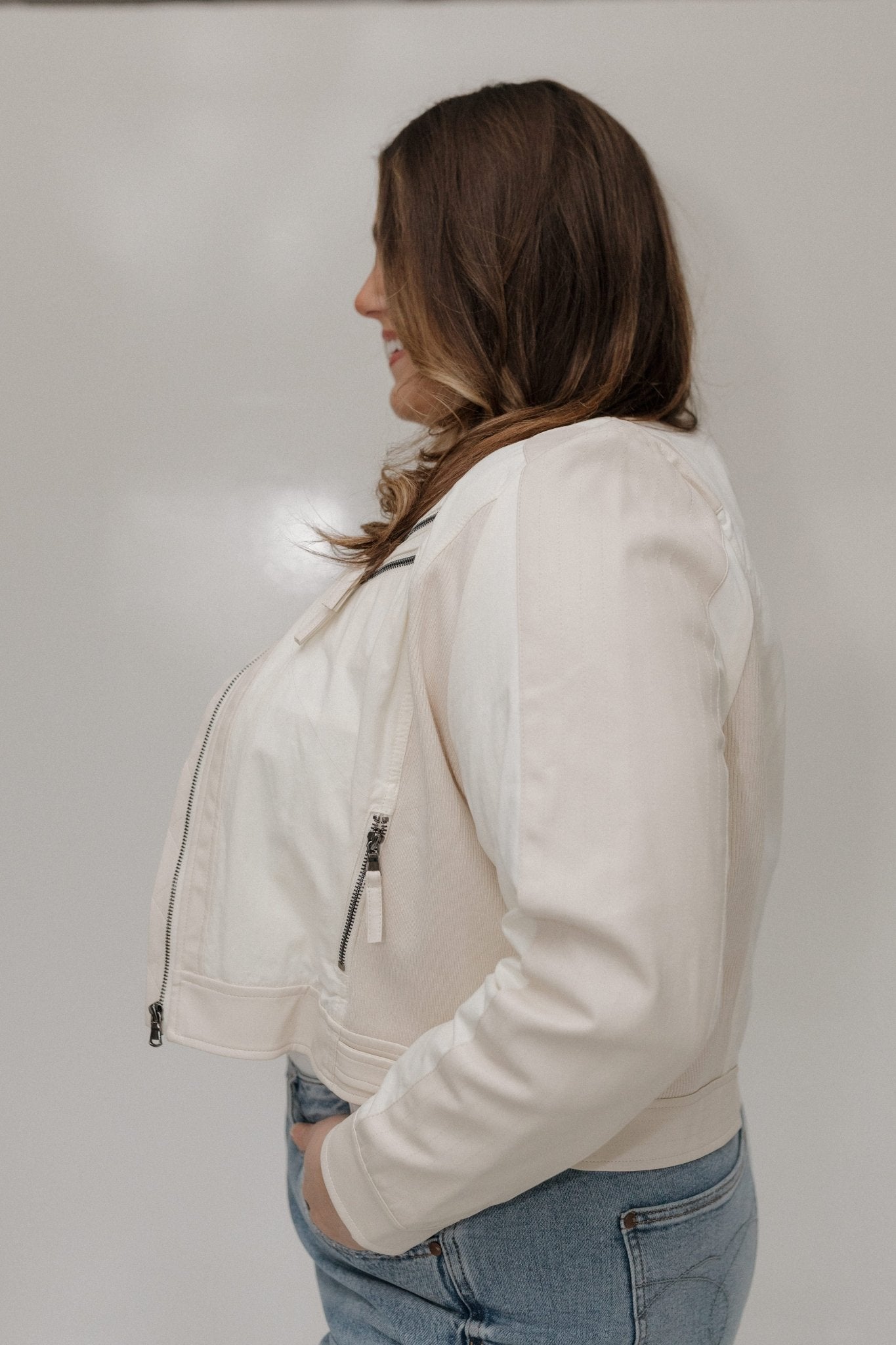 Meet the jacket that proves neutrals don’t have to be boring. The Cropped Faux Leather Moto Jacket in Cream delivers all the edge of a classic moto with a softer, elevated twist. Designed with flattering darting throughout, this piece creates beautiful shape while still feeling comfortable and wearable.
