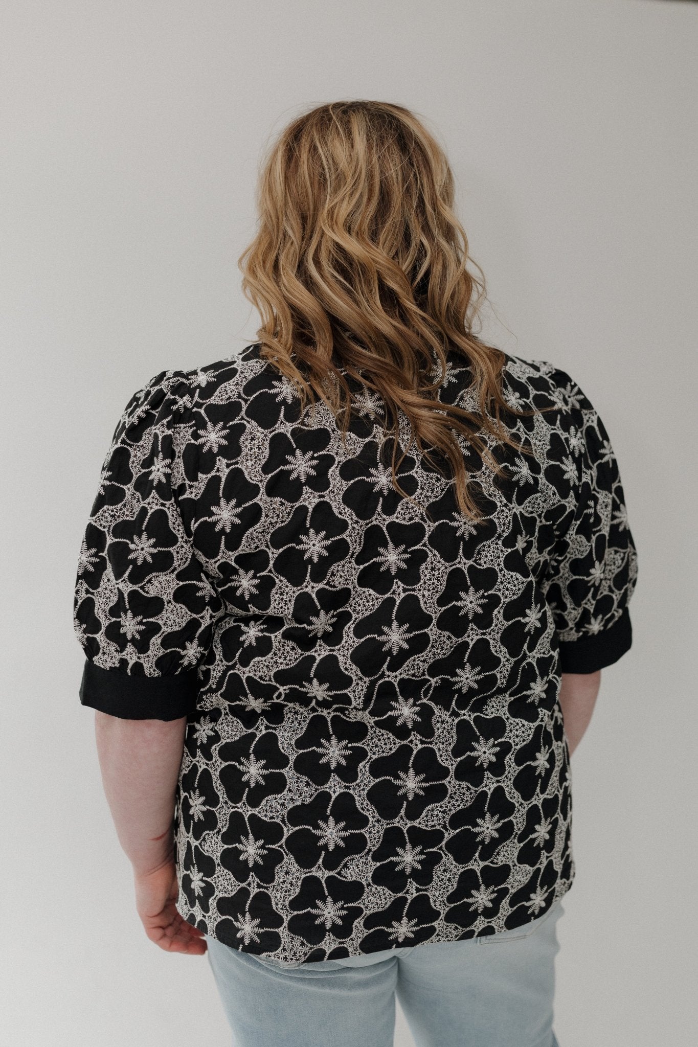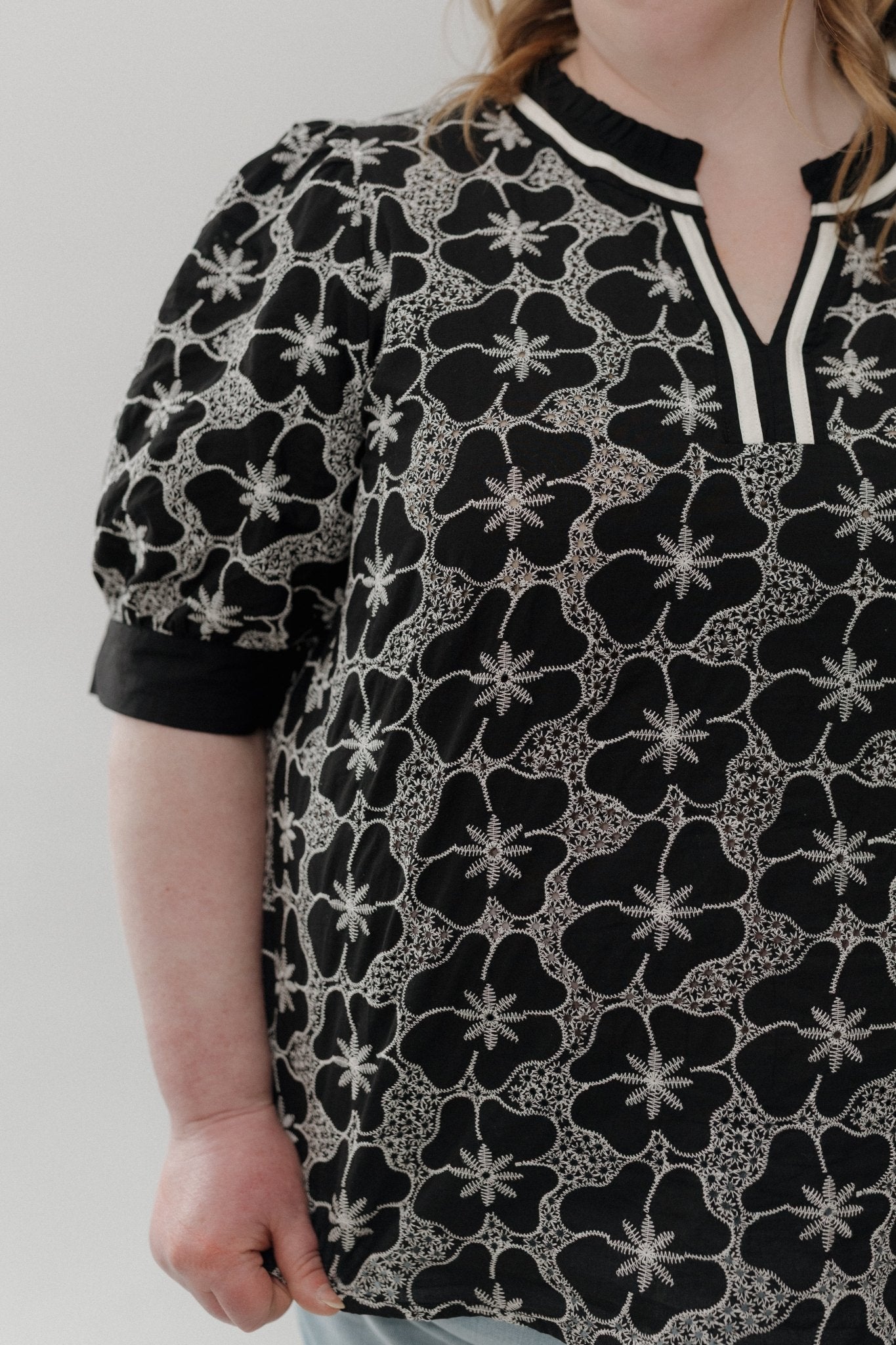 Meet the top that makes “effortless but polished” look easy. The Floral Embroidered Top is designed for mid-size and plus-size women who want breathable comfort with elevated detail. Featuring a contrast-trim split neckline and short puff sleeves, this piece blends feminine charm with everyday versatility.