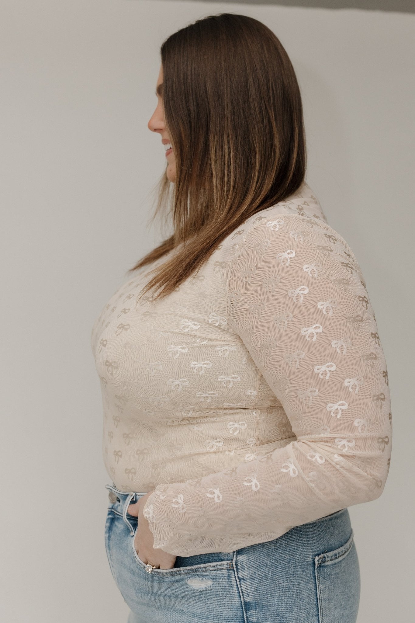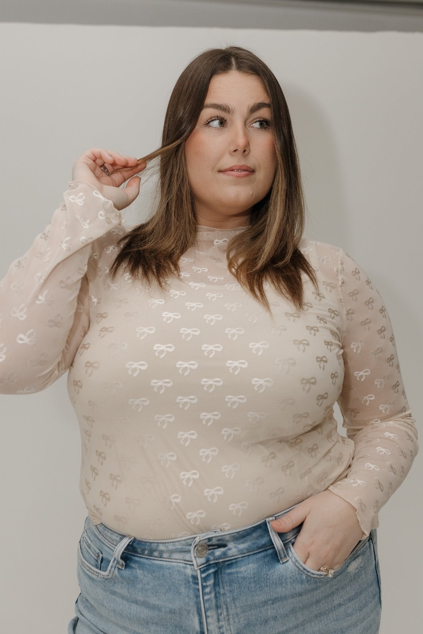 Meet your new statement top! The Sheer Mesh Turtleneck Top in Cream is designed for mid & plus-size women who want chic, feminine style with a hint of allure. Crafted in soft sheer mesh fabric (90% Nylon, 10% Spandex), it features tonal bow embroidery and long sleeves for a delicate, elegant look. Perfect for date nights, brunches, layering under blazers, or weekend outings, this top is both versatile and flattering.