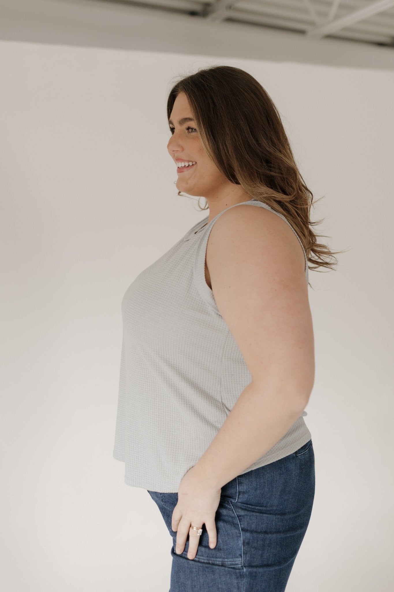 Meet your new everyday layering essential: the Thermal Round Neck Knit Tank Top in Pearl Grey. Designed for mid-size and plus-size women who love effortless basics with a touch of personality, this tank features a classic round neckline, a simple, flattering fit, and a subtle patch detail on the back for a playful twist.
