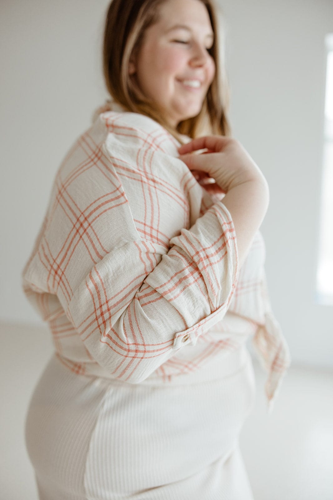 Add a playful touch to your wardrobe with our off-white and coral plaid button-up blouse. This trendy top features a collar and rolled sleeve option, as well as a front tie that adds a fun flair to any outfit. Embrace your quirky side and stand out with this unique blouse! Fits true to size. We suggest going with your typical size. Cara is wearing a size 3x. Want more information about the model? Visit our Lovely Models page.