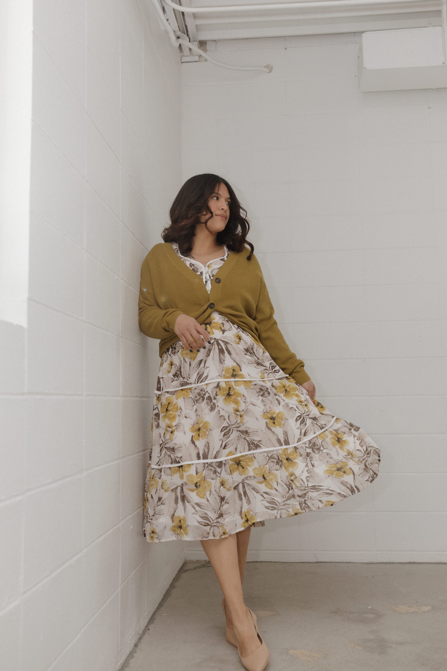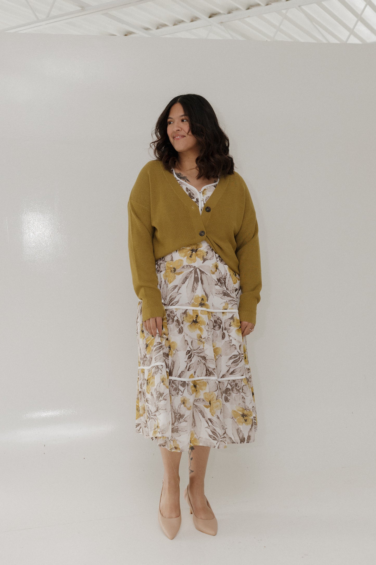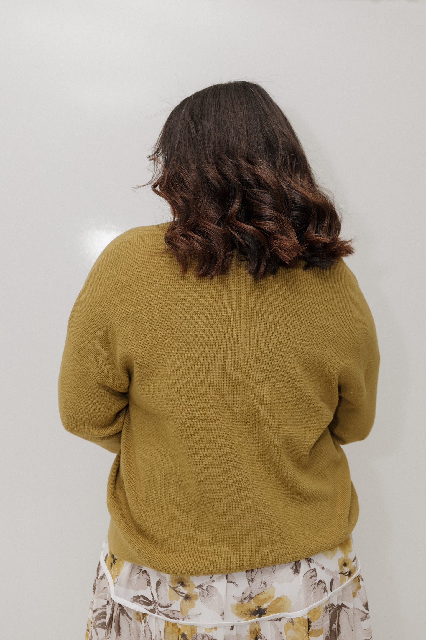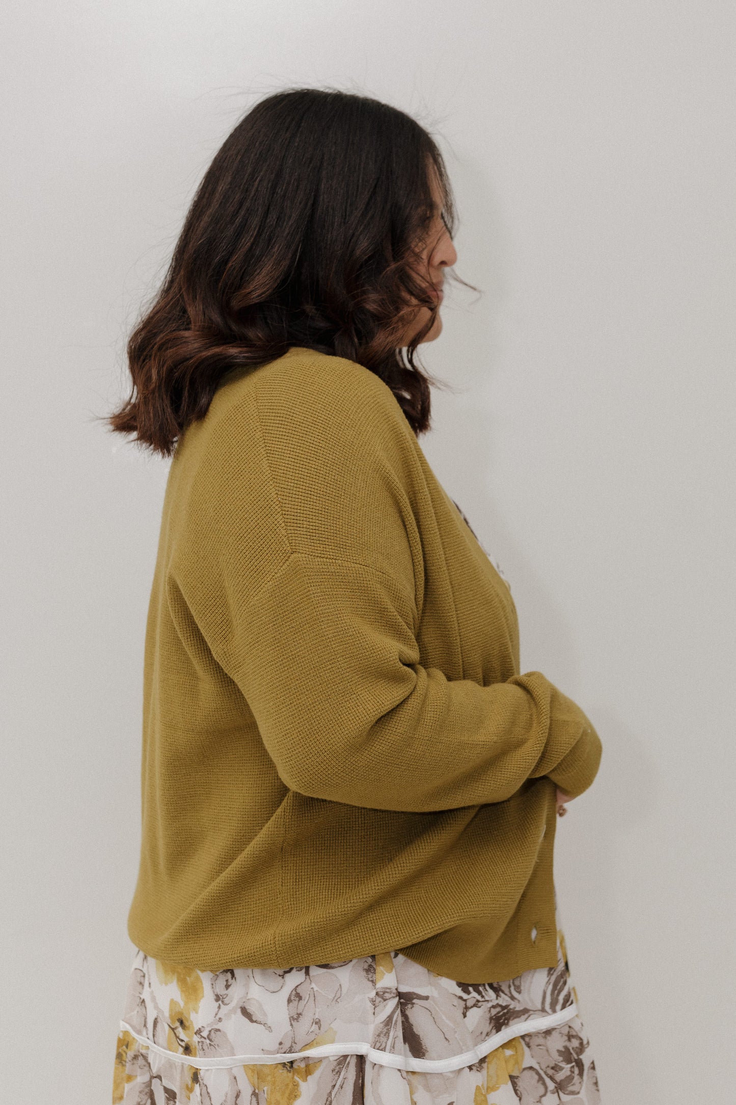 Cozy up in the Textured Button Front Cardigan in Golden Olive, a plush, mid-weight knit designed for mid-size and plus-size women. Featuring a flattering hip-length silhouette, ribbed hem and cuffs, and a unique button-front design, this cardigan is perfect for layering on chilly days or adding a stylish pop of color to your casual outfits.