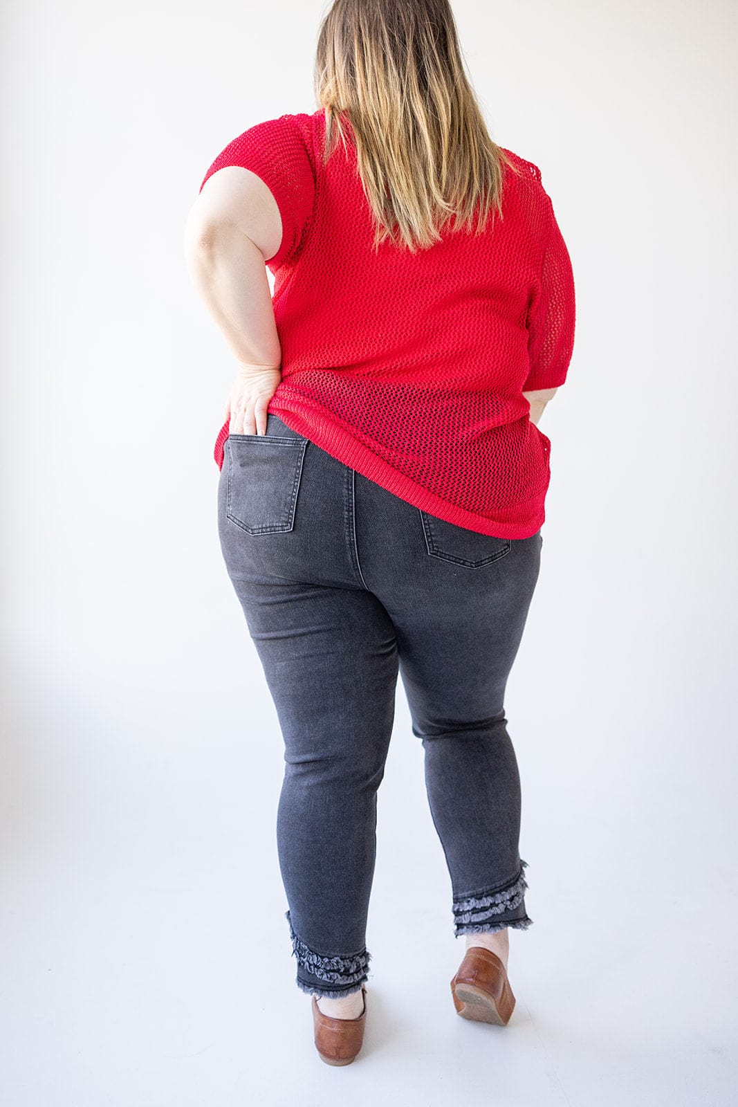 Looking to take your skinny jeans to the next level? Look no further than this gorgeous pair of vintage-washed black, high-rise skinny jeans! The frayed edging along the ankle is going to look so great with sandals, booties, or even a cute pair of sneakers! Details like this are going to elevate your skinny jeans game. These are a relaxed fit and extremely stretchy yet structured fabric. They are sure to hold up all day without giving you the dreaded saggy butt!