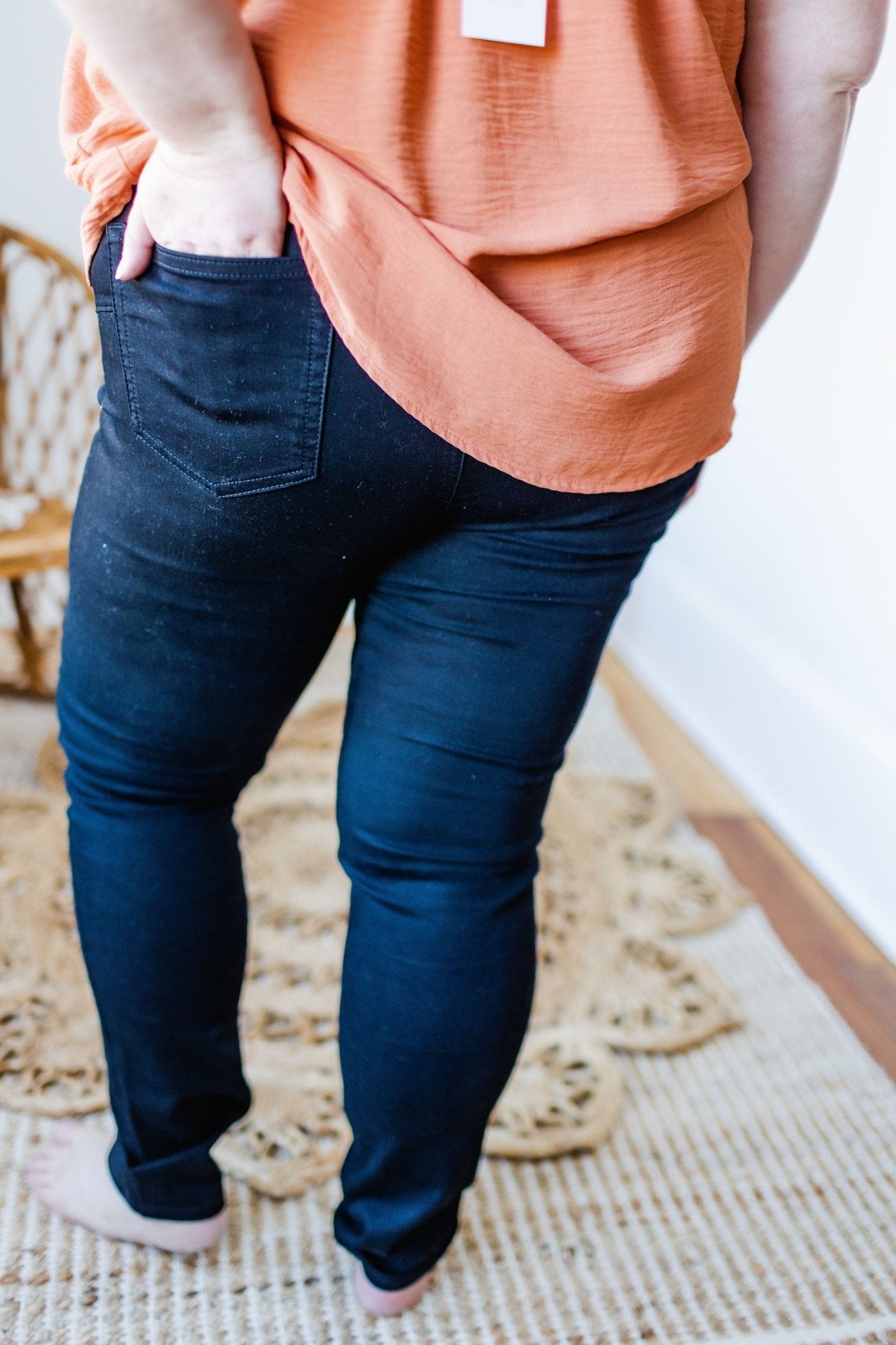 Black mid-rise stretch skinny jean has push-up to enhance a tush and contouring to smooth.