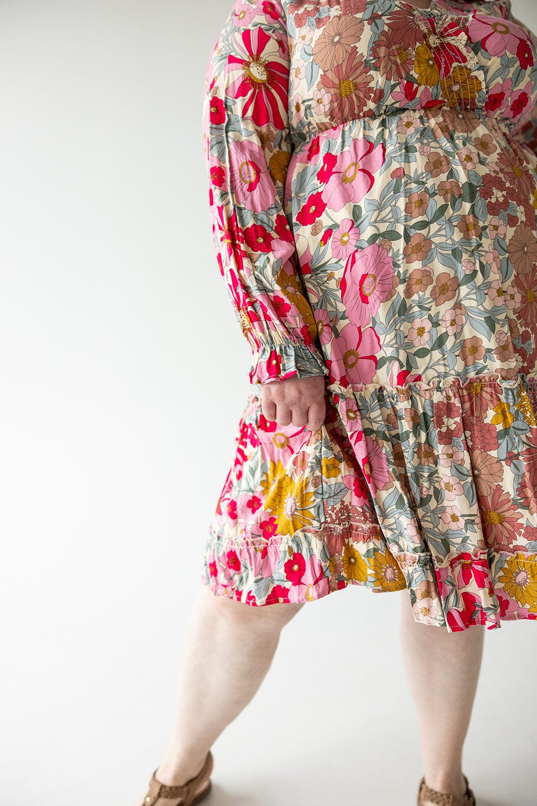 Turn heads in our SMOCKED BODICE BOHO DRESS! With a playful smocked v-neckline, blouson sleeves, and a ruffle kick hem, this knee-length dress features a large boho floral pattern for a whimsical touch. Perfect for any occasion, this dress is sure to add some fun to your wardrobe. Fits true to size. We suggest going with your typical. Leslie is wearing a size 3x. Want more information about the model? Visit our Lovely Models page.