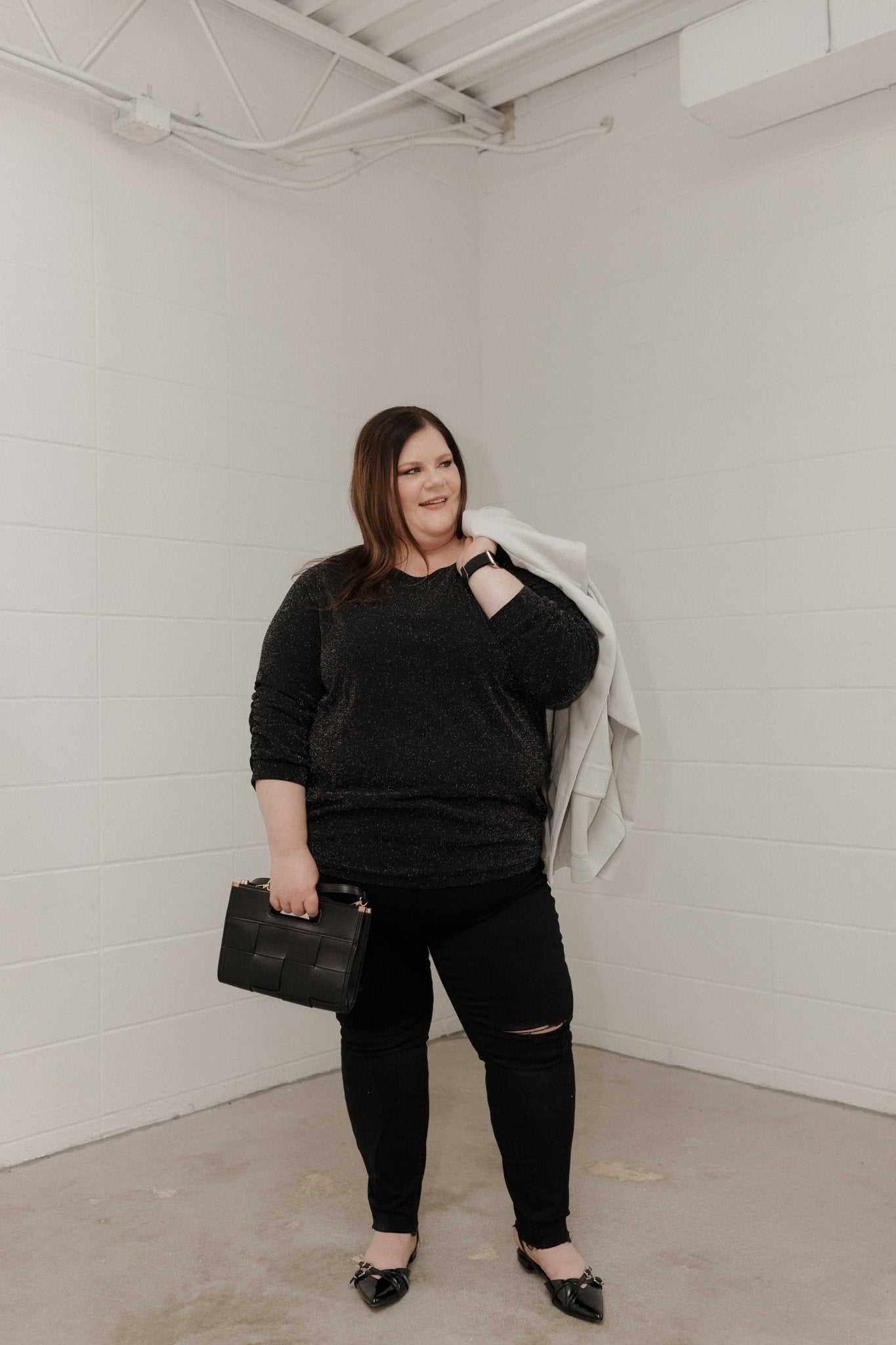 Shimmery Ruched Sleeve Blouse – Black