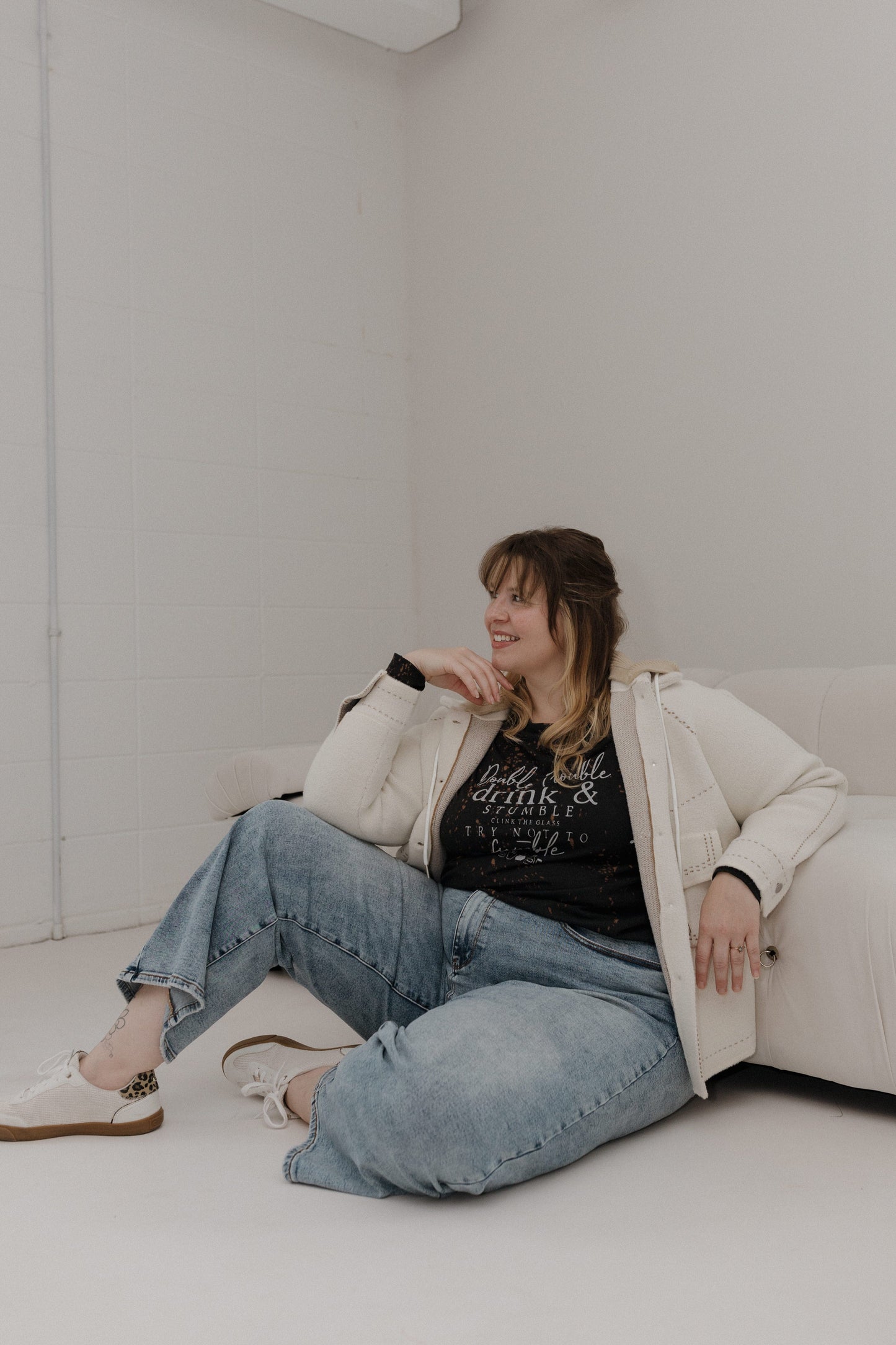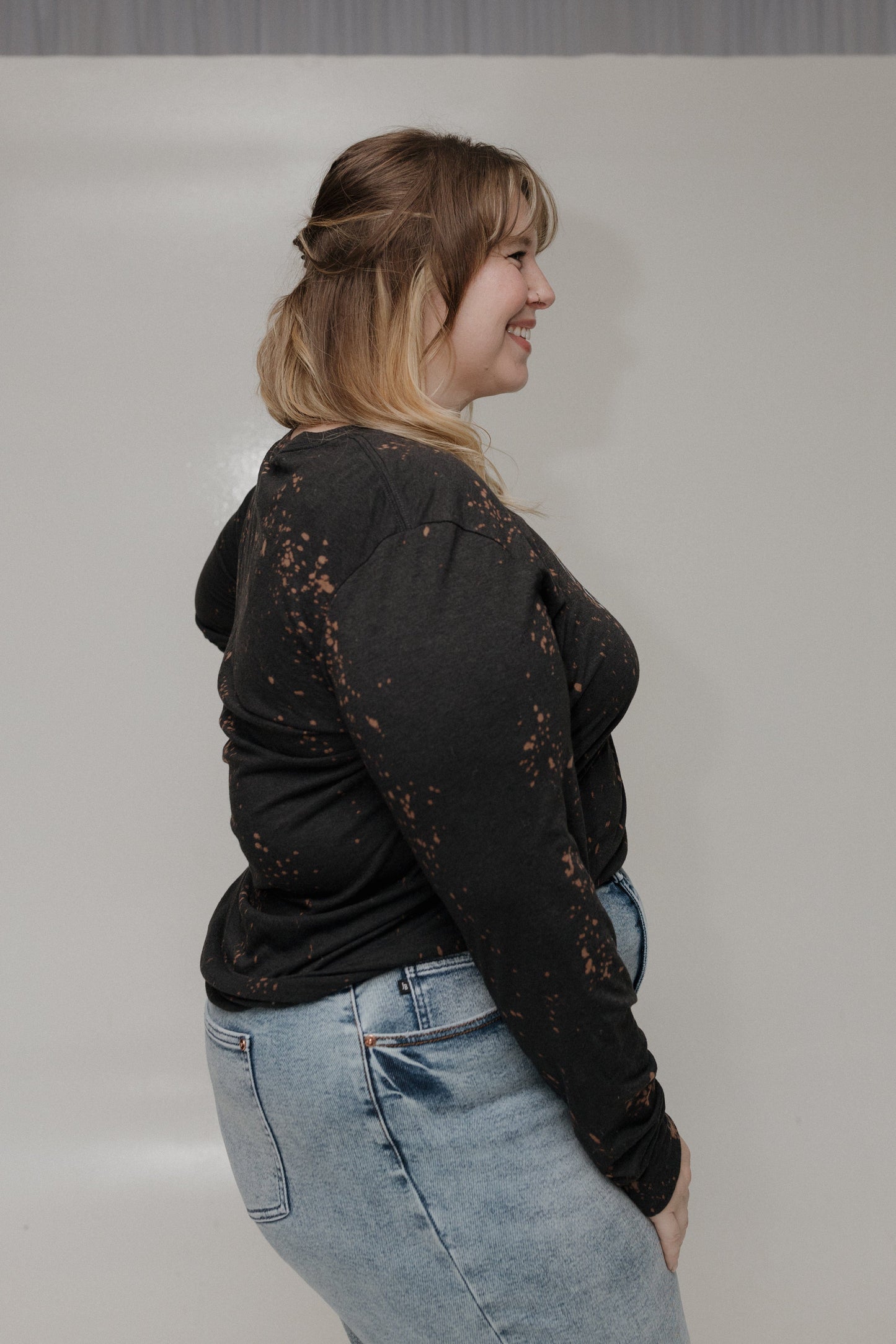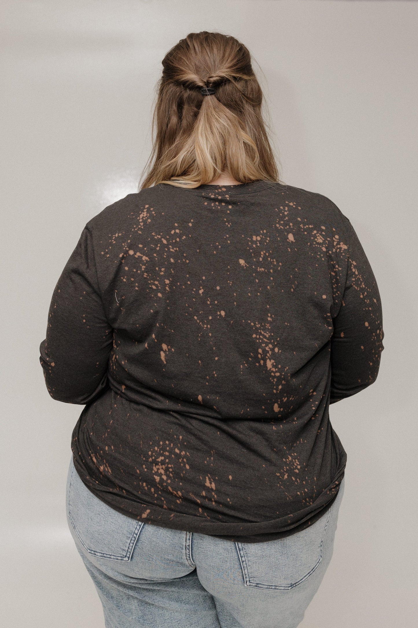 This tee is perfect for the Halloween season or anytime this type of warning is necessary! All of these great tees are hand bleached, so every one is unique! It has a crew neckline, long-cuffed sleeves, super soft fabric, splatter bleach design, and fun quote, "Double trouble drink and stumble clink the glass try not to stumble." Fits true to size. Stacey is wearing a size 3x. Want more information about the model? Visit our Lovely Models page.
