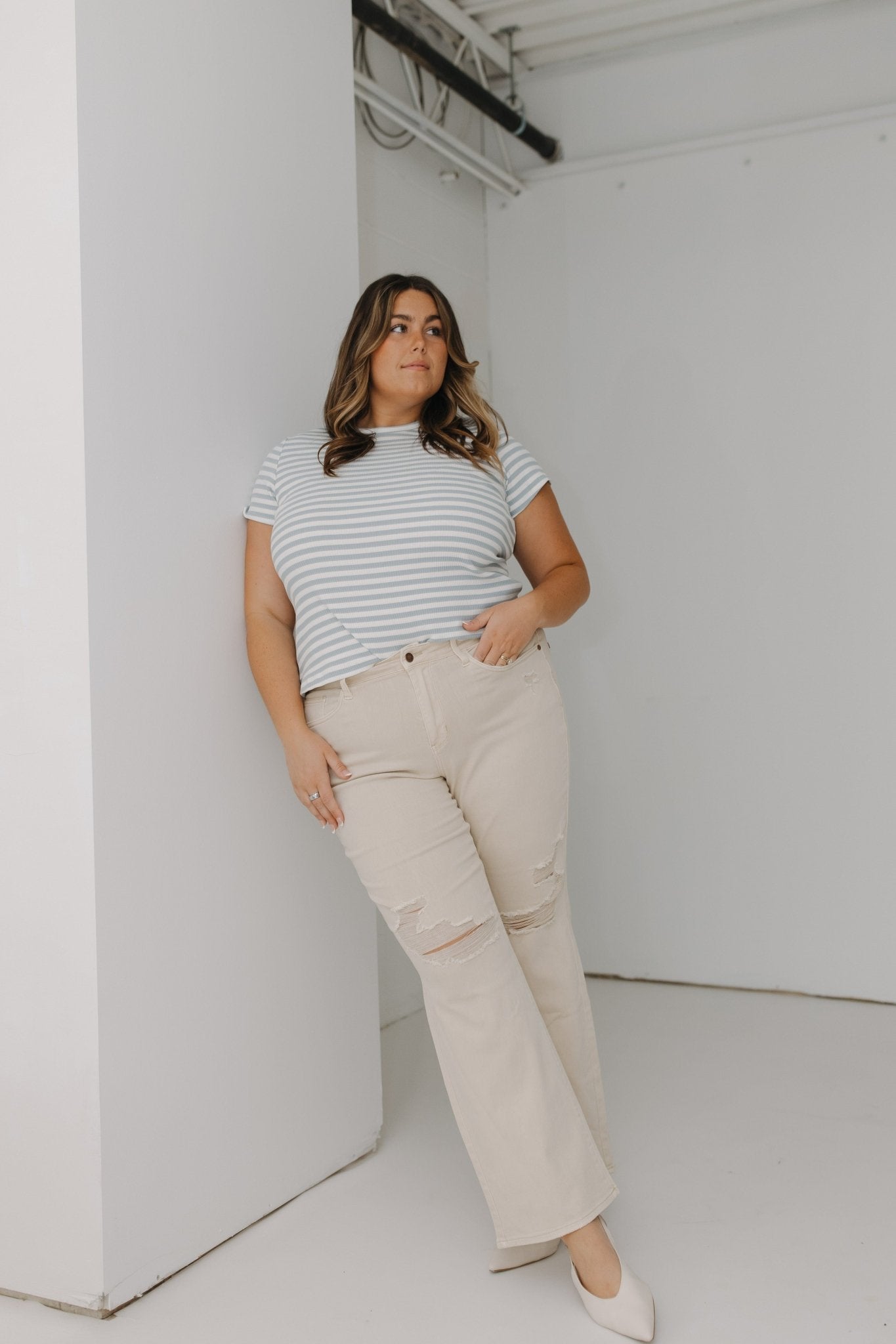 ESSENTIAL SHORT SLEEVE RIBBED CREW NECK TEE IN ECRU AND WISP
