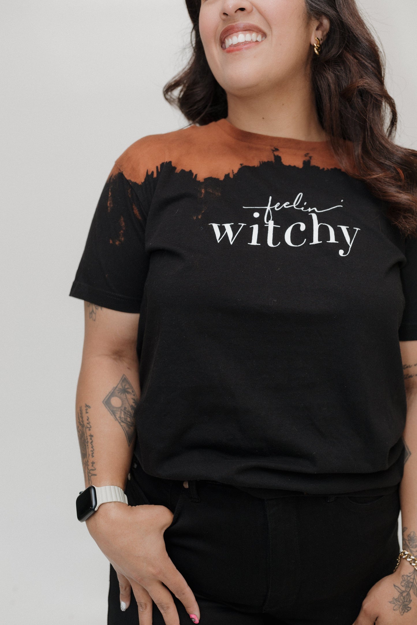 This fun graphic tee is perfect for the upcoming Halloween holiday, or any day that you're feelin' witchy! All of these great tees are hand bleached, so each one is unique! It has a crew neckline, ombre bleach wash, short sleeves, and a fun sassy saying! Fits true to size.