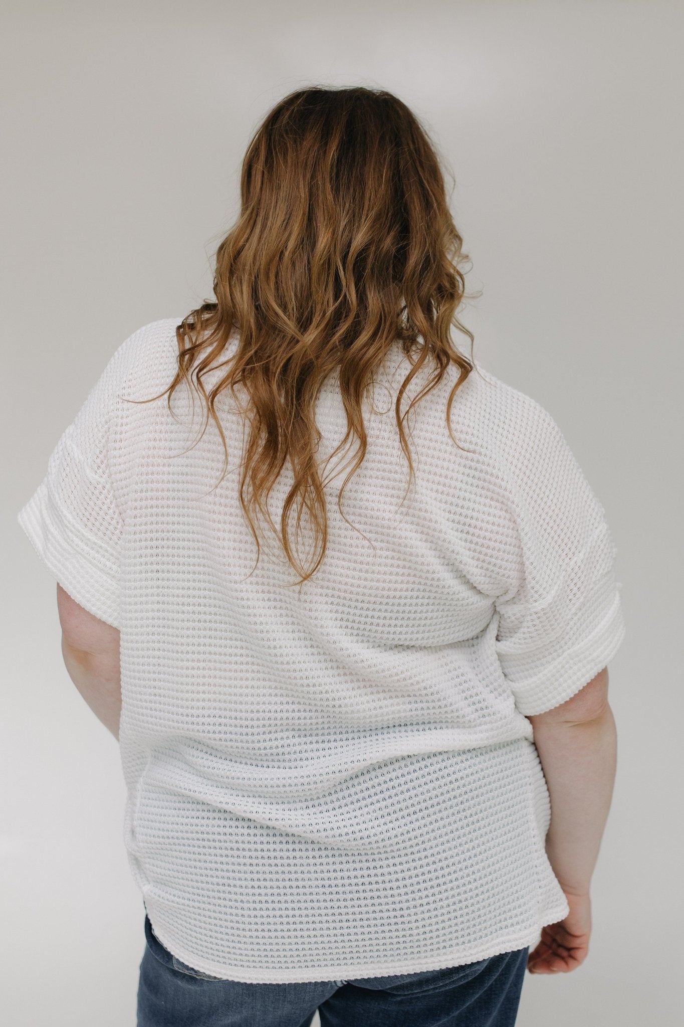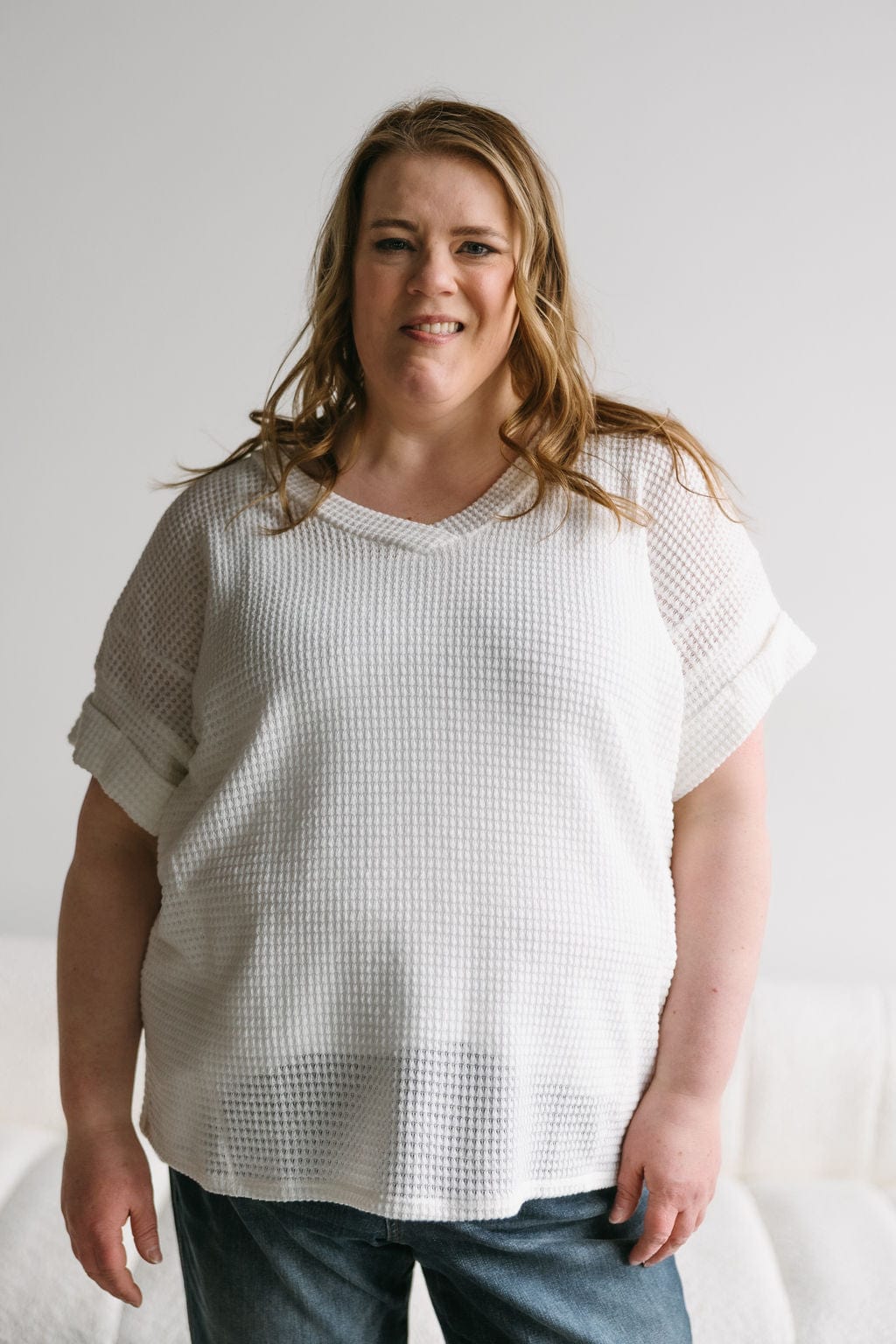 Looking for a lightweight, open weave top that's both stylish and comfy? Look no further than our V-neck tee in sunkissed ecru. With its flattering cut and crochet-knit fabric, this versatile top is perfect for any season. Add it to your wardrobe today, available at Love Marlow! Fits true to size. Leslie is wearing a size 2x. Want more information about the model? Visit our Lovely Models page.