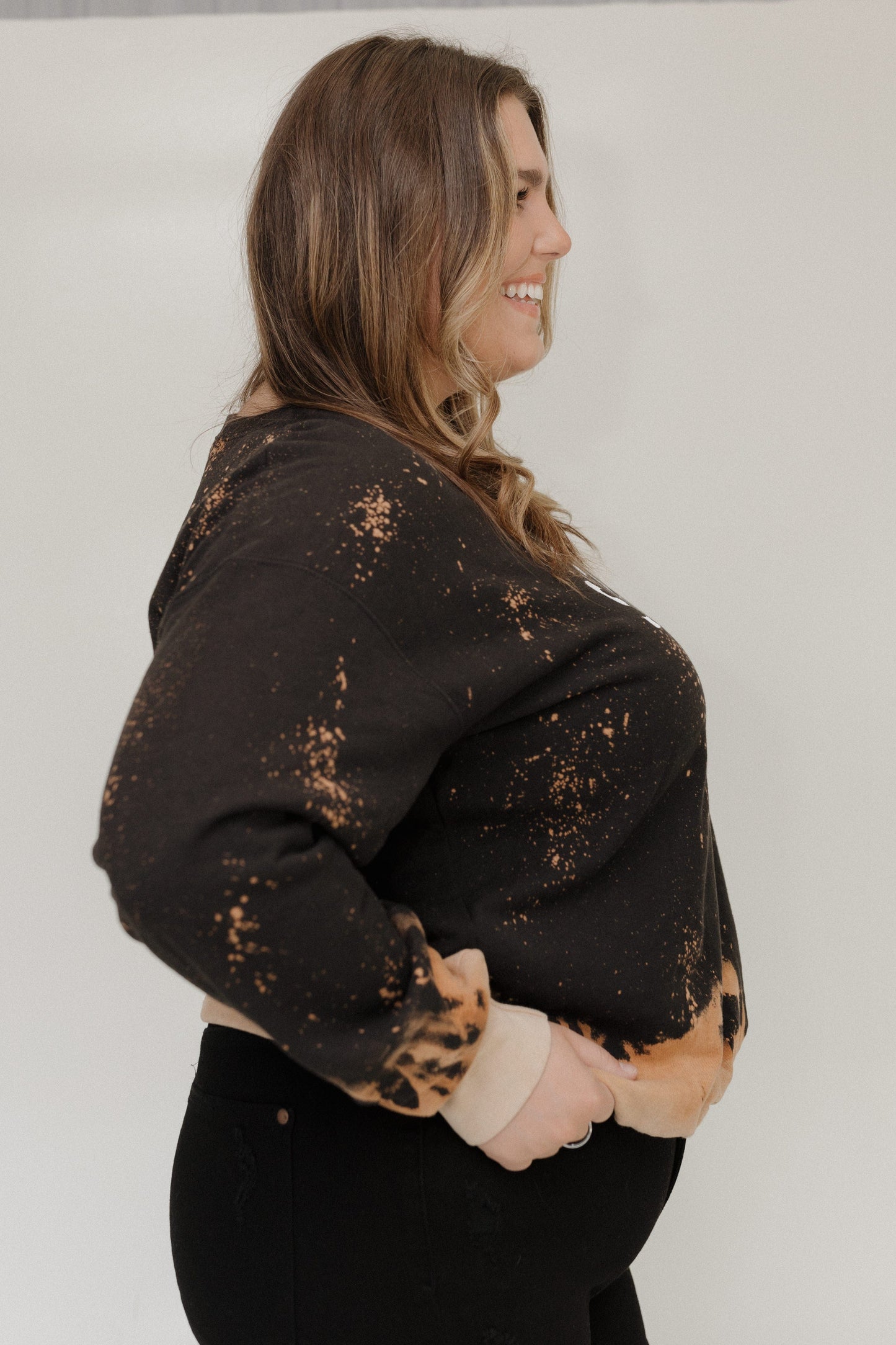 You'll smile every time you put this fun sweatshirt on! This tee is the perfect mix of Halloween and everyday fun! All of these great tees are hand bleached, so every one is unique! It has a crew neckline, splatter bleach design, long-sleeves, and fun "You put a spell on me now let's wine," graphic. Fits true to size.