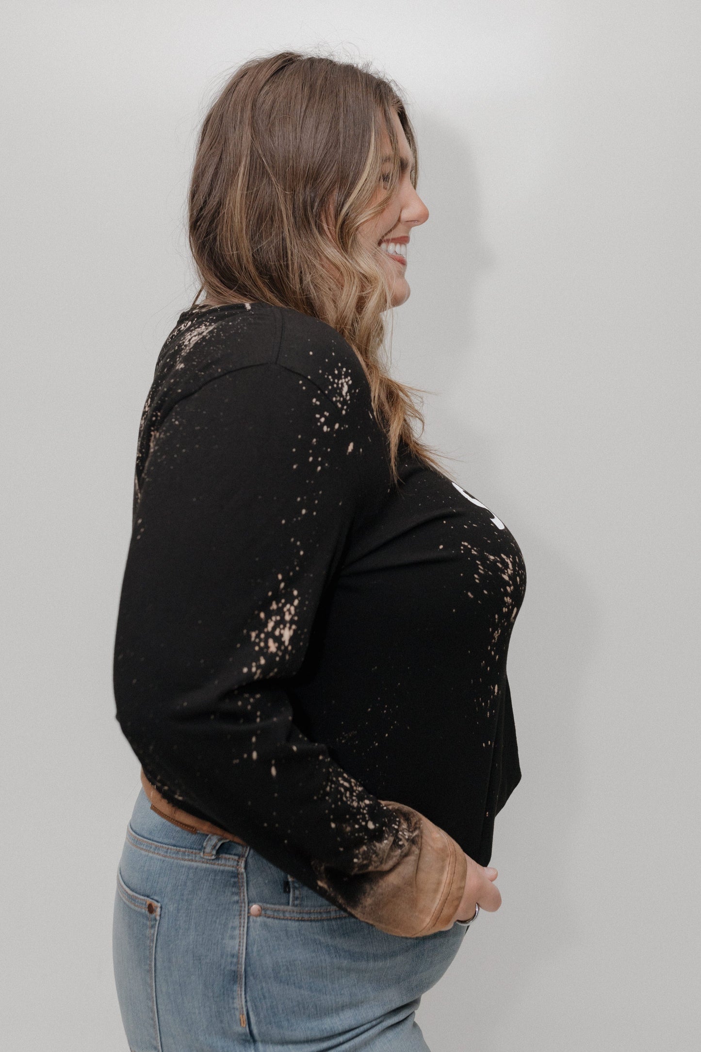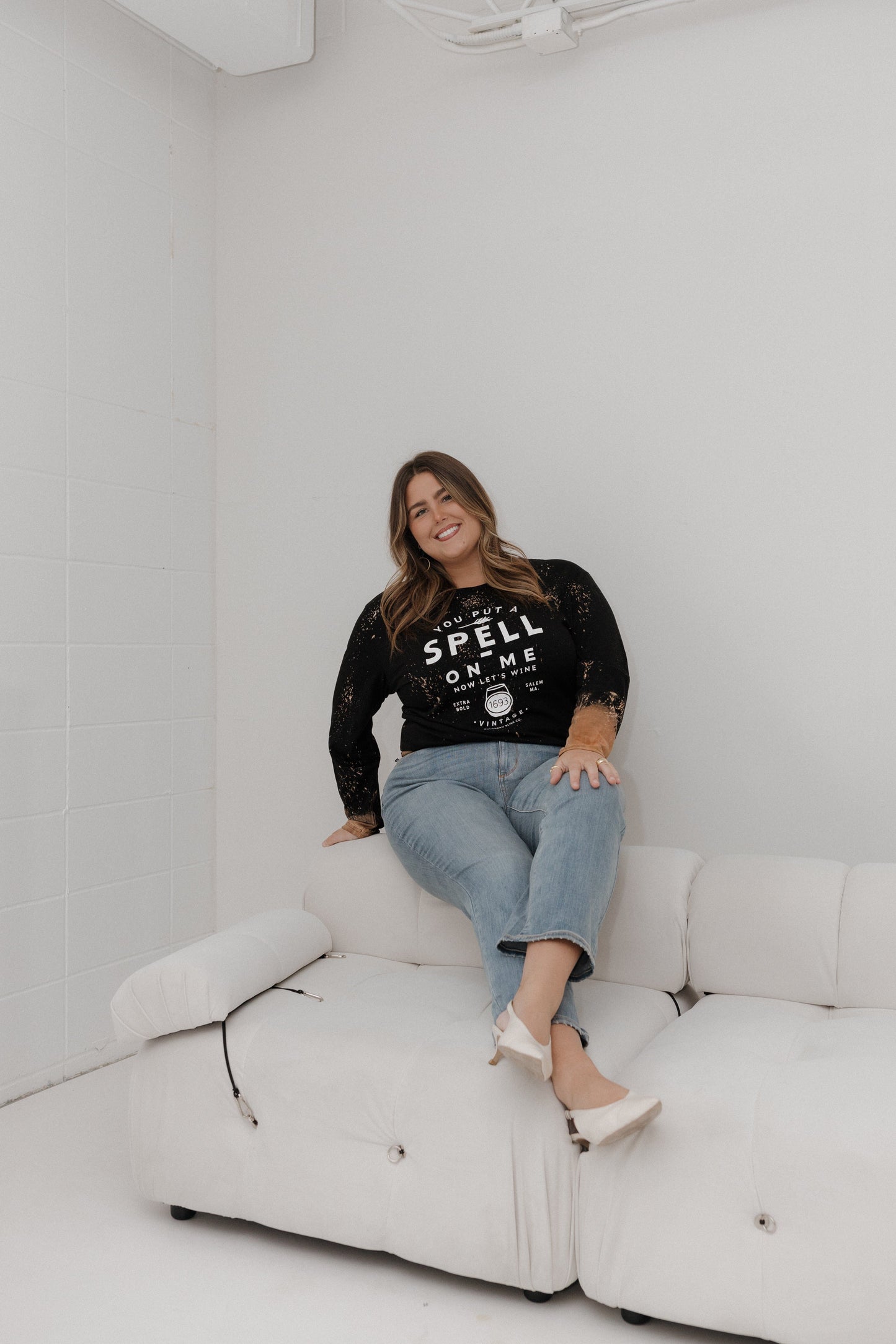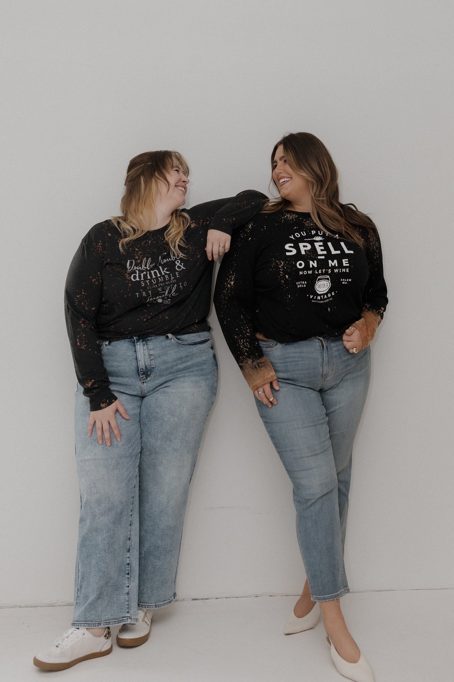 This tee is the perfect mix of Halloween and everyday fun, it will make you smile every time you put it on! All of these great tees are hand bleached, so every one is unique! It has a crew neckline, splatter bleach design, short sleeves, and fun "You put a spell on me now let's wine," graphic. Fits true to size.