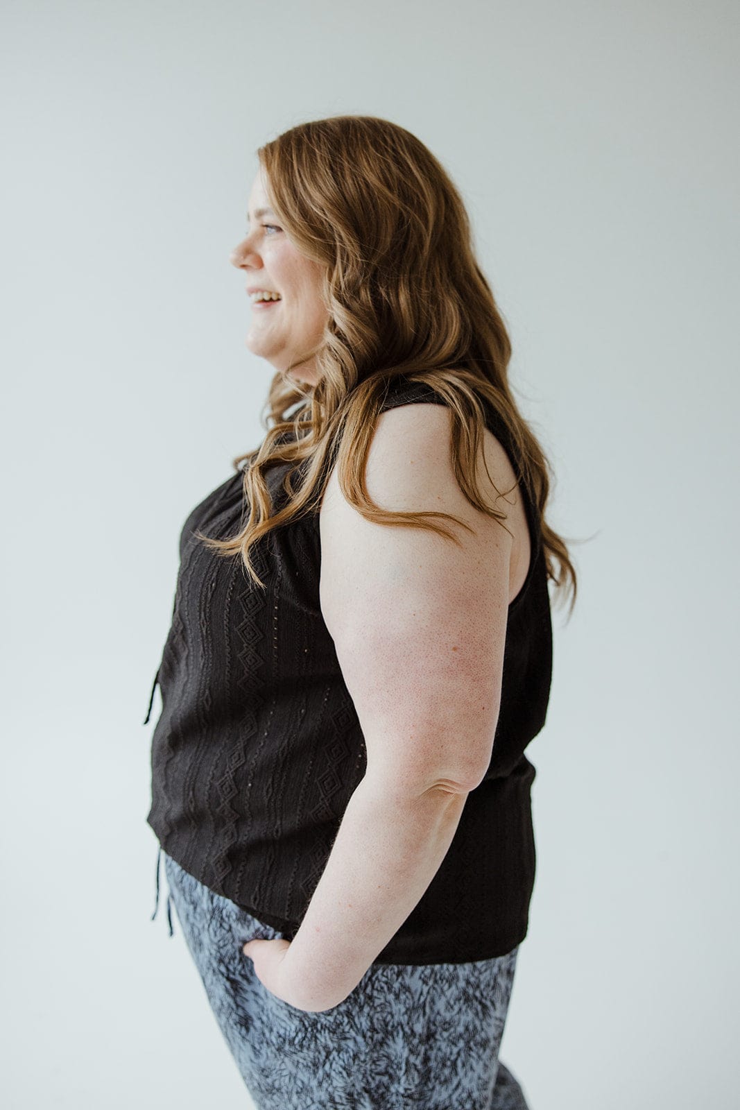 Add a touch of whimsy to your wardrobe with our Lace Peasant Tank! Featuring a tied keyhole neckline and smocked bustline, this top flaunts intricate embroidered geometric lace for a playful twist on a classic design. Perfect for adding some charm to any outfit. Fits true to size. We suggest going with your typical size. Leslie is wearing a size 2x. Want more information about the model? Visit our Lovely Models page.