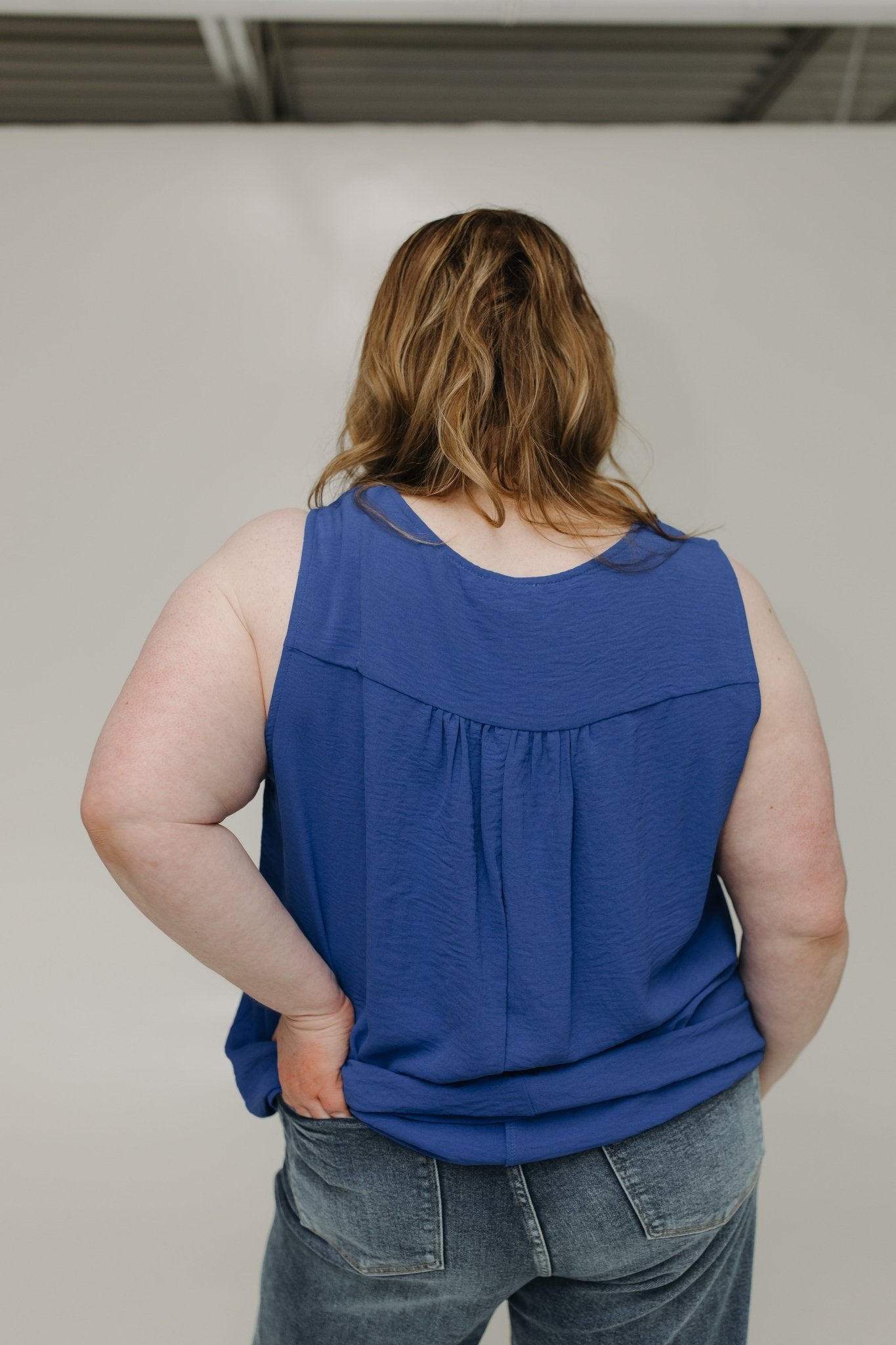The Texture Tank with Front Pleat in Boss Blue is your go-to when you want to feel cool, confident, and completely in charge. This plus-size V-neck tank is designed with bra-friendly wide straps, a soft front pleat for a draped, flowy fit, and a ruched back that adds stretch and subtle shape where you want it most.