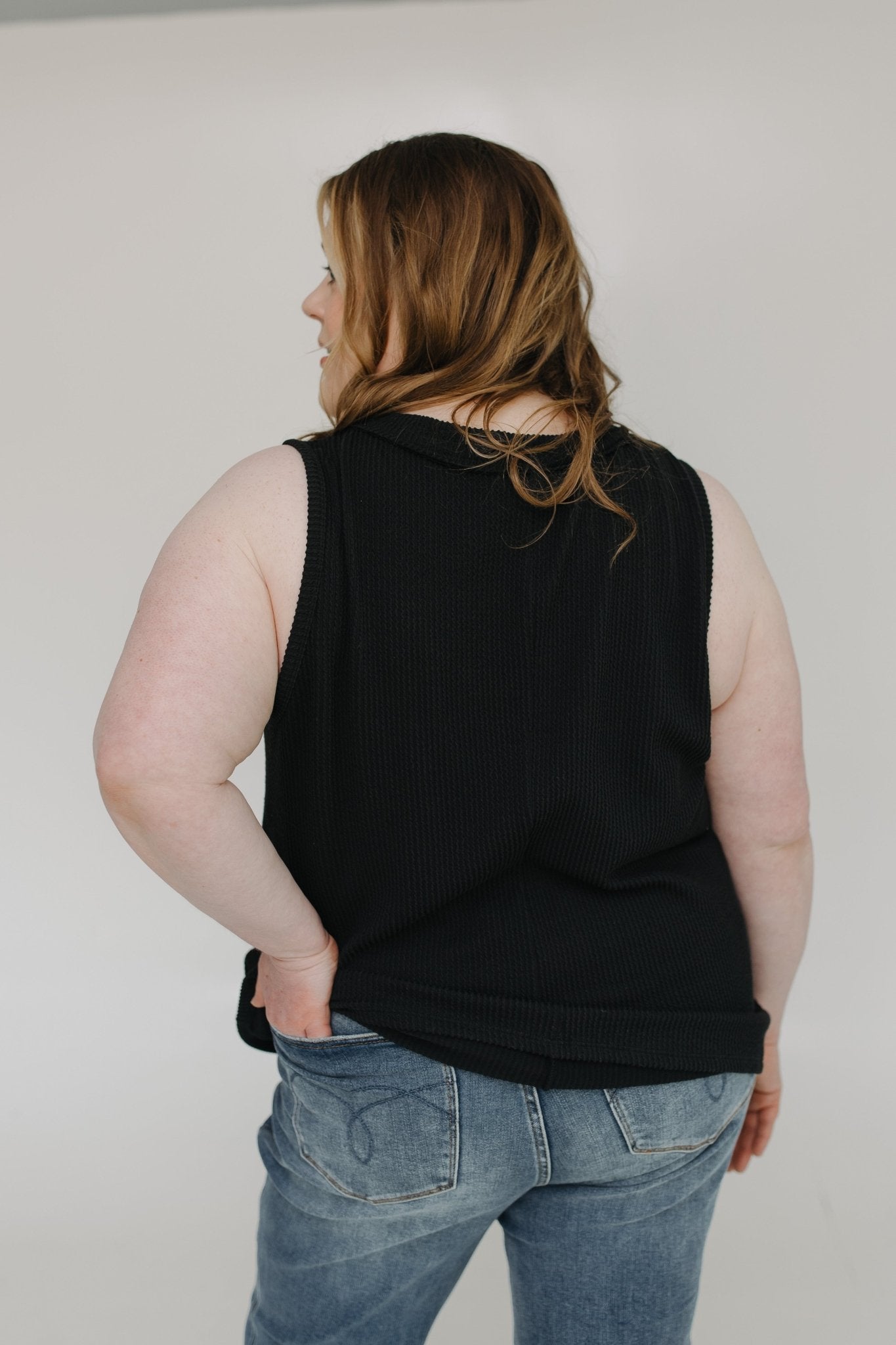 TEXTURED V-NECK TANK WITH WIDE STRAPS IN BLACK