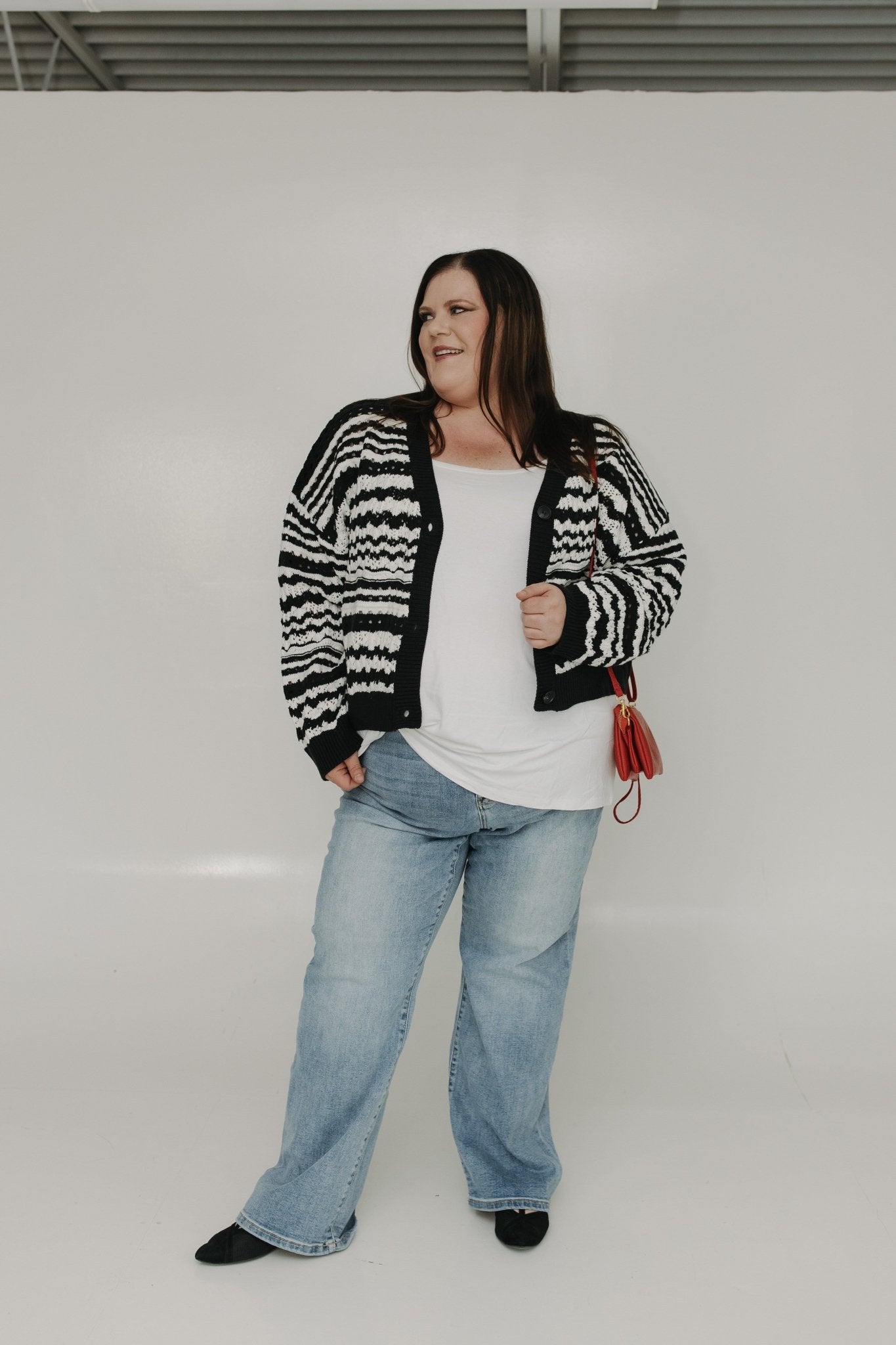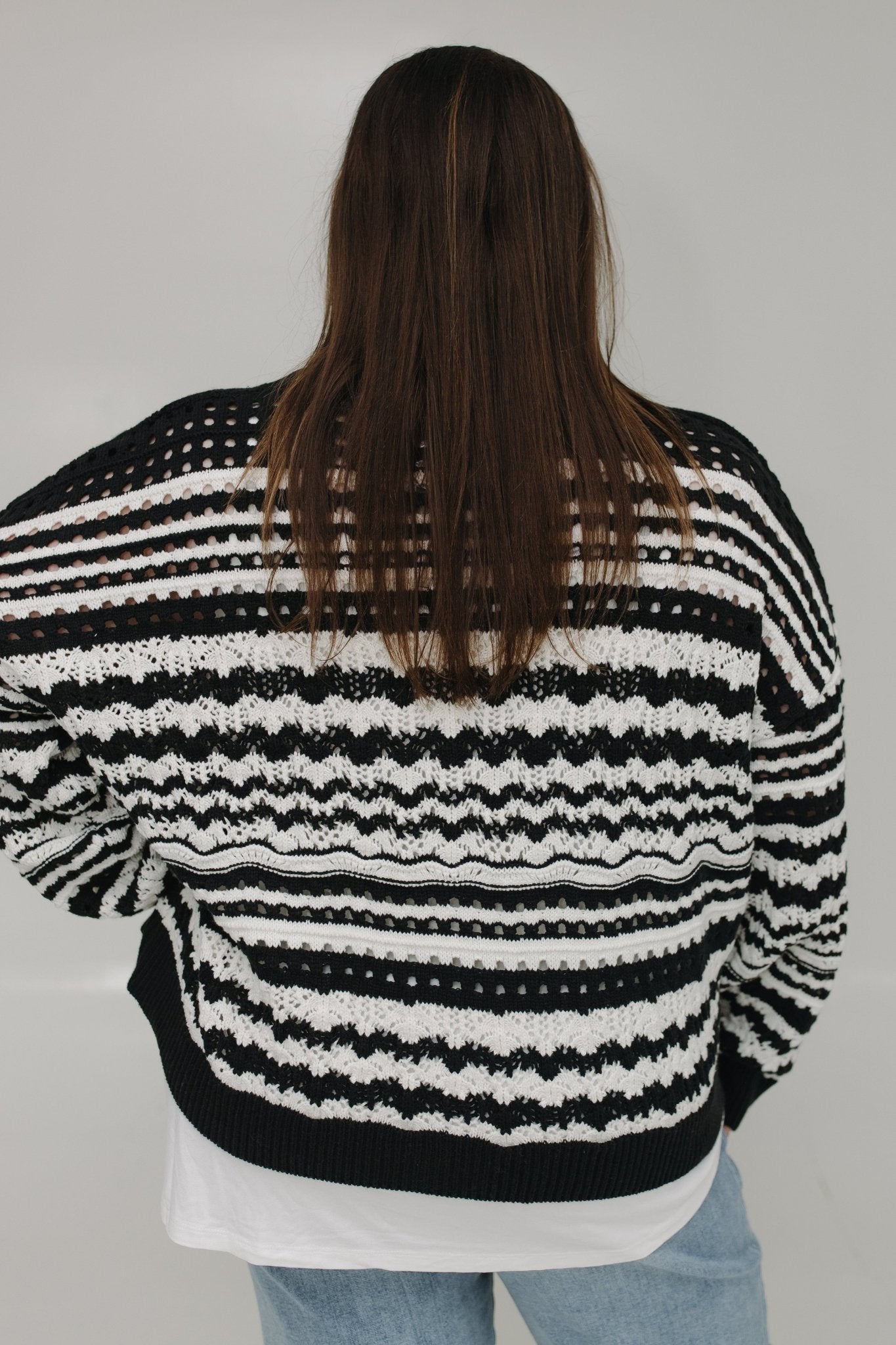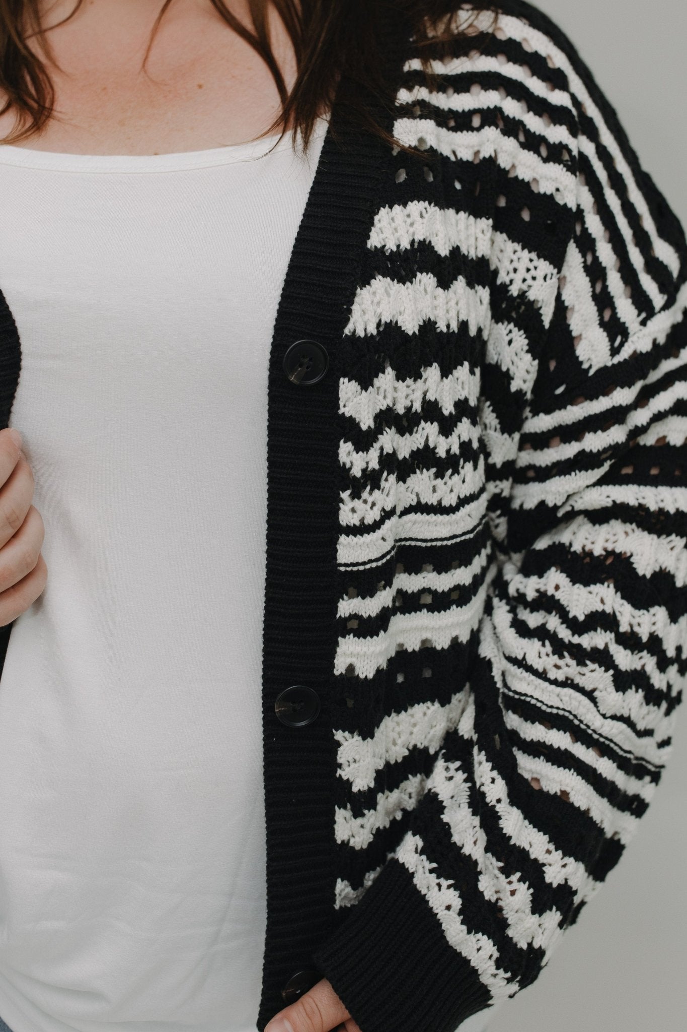 Say hello to effortless cool with the Crochet Button-Up Cardigan with Retro Stripes—a lightweight layering essential with just the right dose of nostalgia. Designed for mid-size and plus-size women, this cardigan features a breathable open crochet knit, flattering V-neckline, functional button-front, and bold black-and-off-white retro stripes that instantly elevate any outfit. Soft cotton-blend yarn ensures comfort while making it perfect for transitional weather and everyday layering.