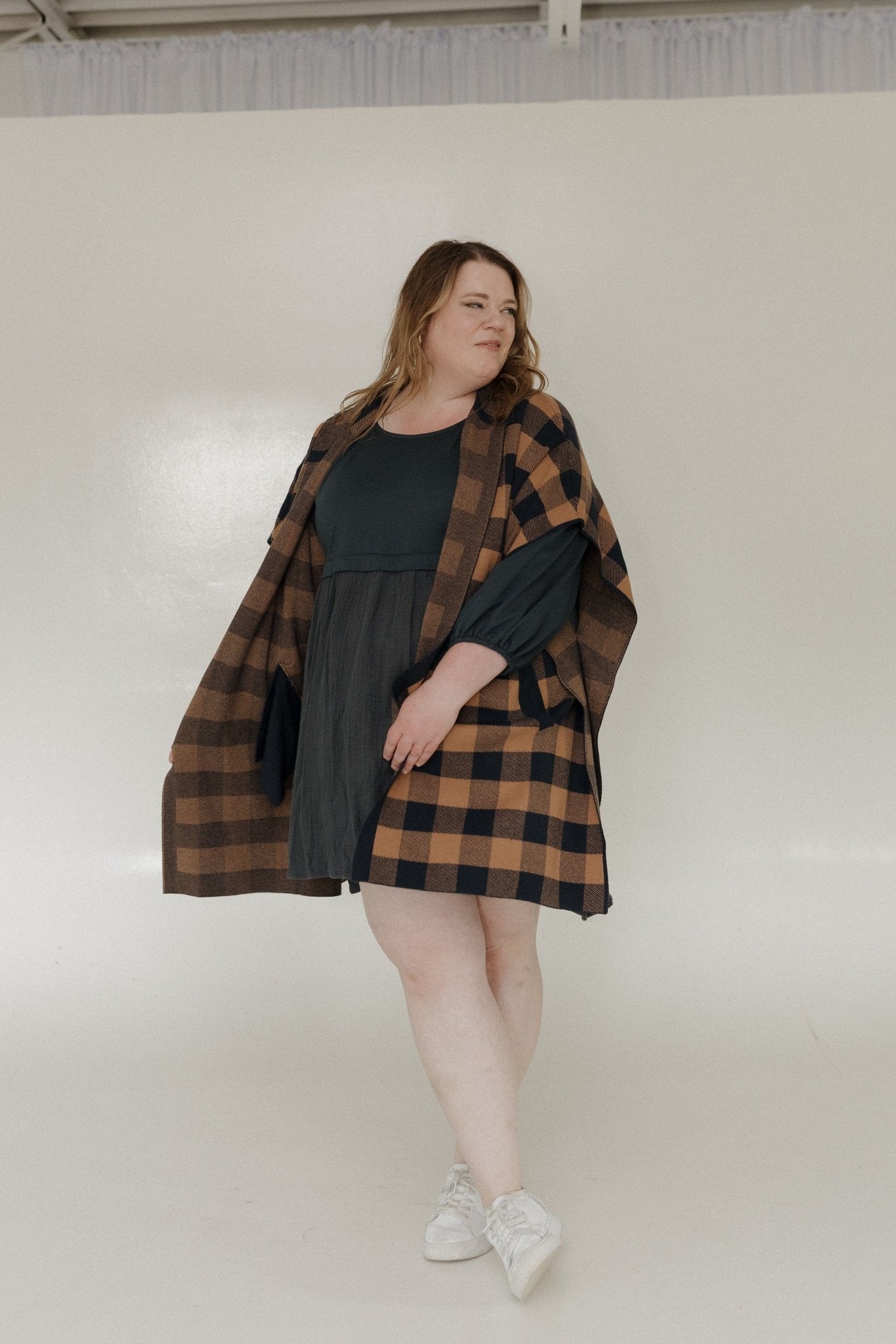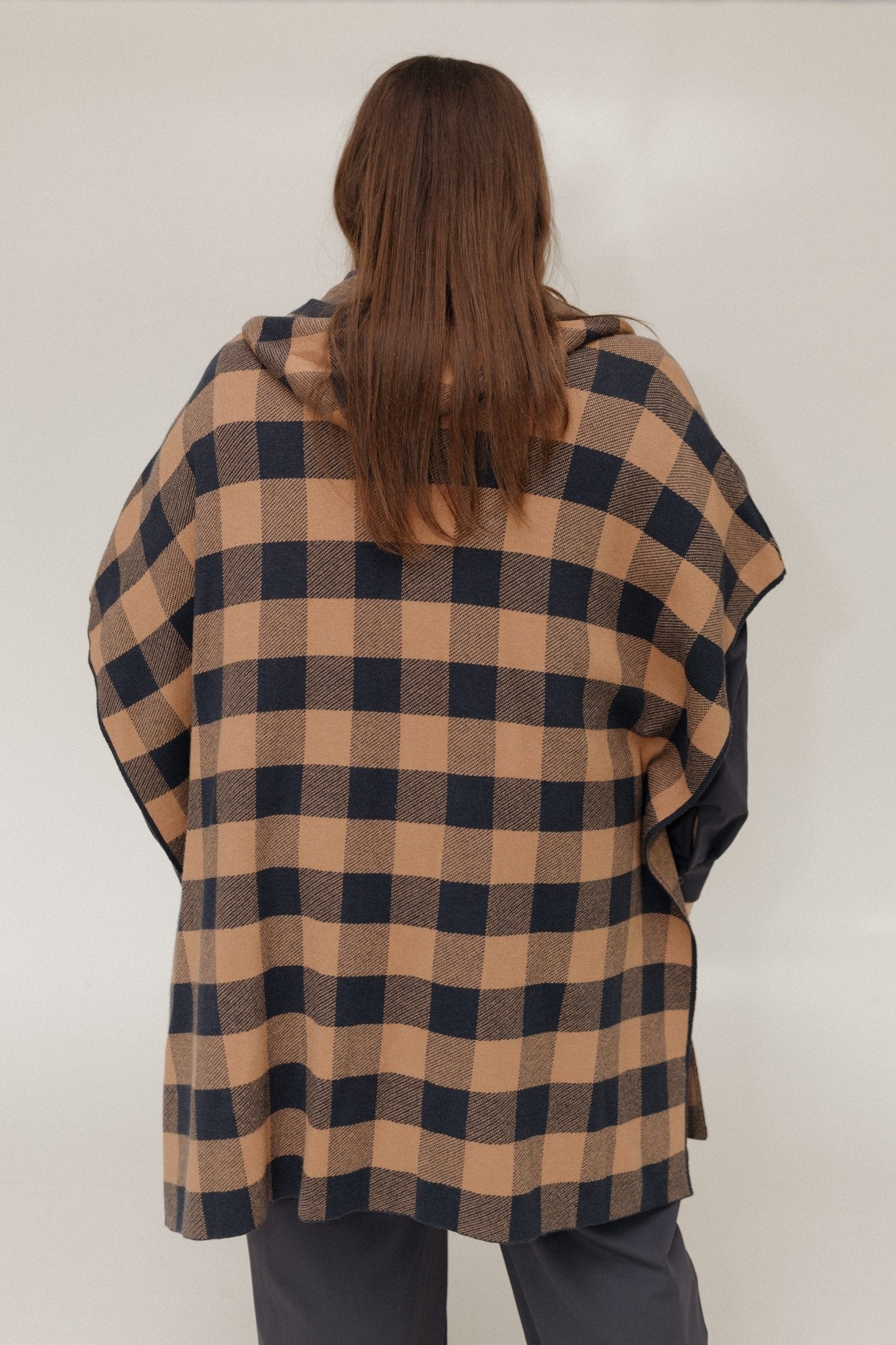 Wrap yourself in cozy sophistication with our Hooded Plaid Cape in Navy and Cork. Designed for mid and plus-size women, this luxurious knit cape is the perfect mix of comfort and class. The soft, high-quality fabric keeps you warm without the bulk, while the 3/4 sleeves and easy throw-on design make it ideal for life on the go. The neutral plaid pattern in navy and cork tones adds rich texture and timeless style, perfect for layering over your favorite sweaters, jeans, or dresses.