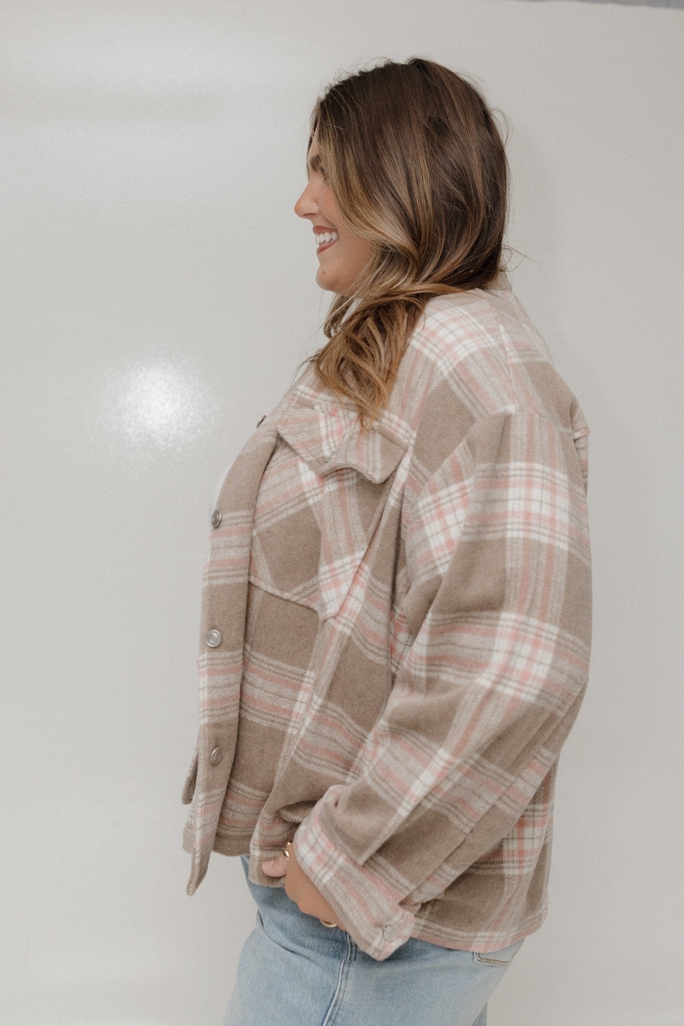 Stay cozy and stylish with our Plaid Shacket in Creme Brulee, the ultimate layering piece for mid and plus-size wardrobes. Perfect for everything from casual days to night-outs, this fuzzy-soft shacket combines fashion and function with chic bust pockets, waist pockets, and comfortable dolman sleeves.