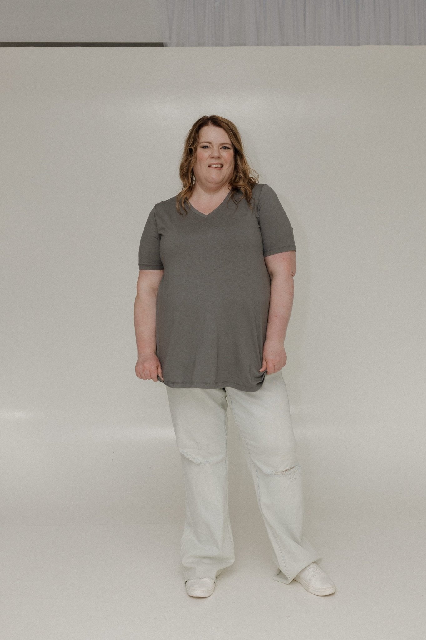 The Essential Boyfriend Fit V-Neck Tee in Charcoal Grey is the timeless staple your wardrobe has been waiting for. Crafted from a luxuriously soft jersey blend (94% Viscose, 6% Elastane), this elevated basic offers the perfect balance of comfort, stretch, and style.