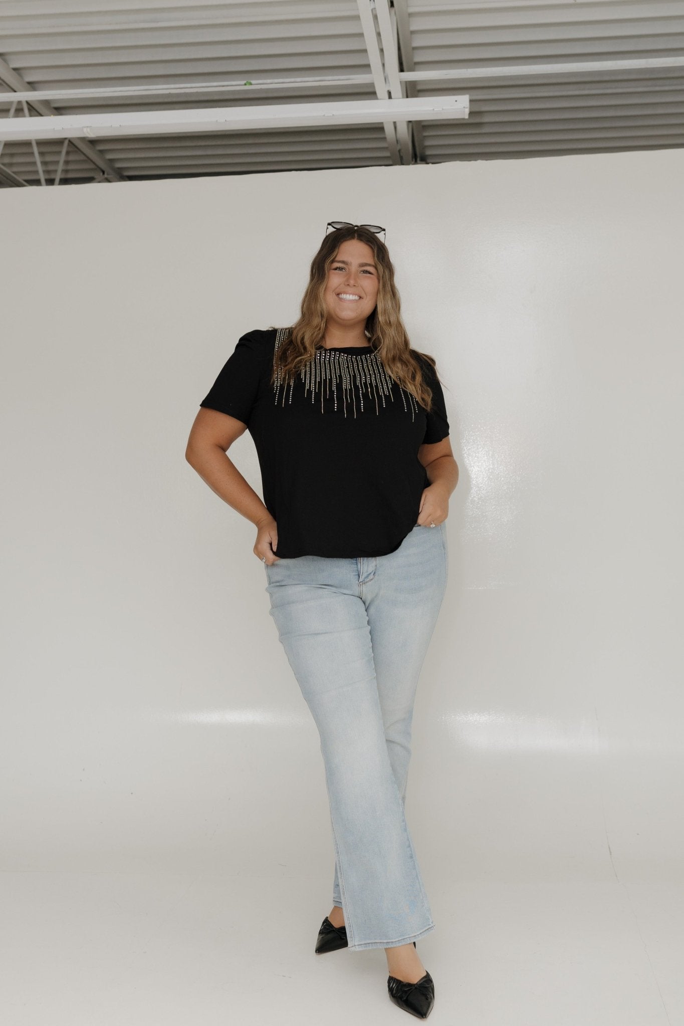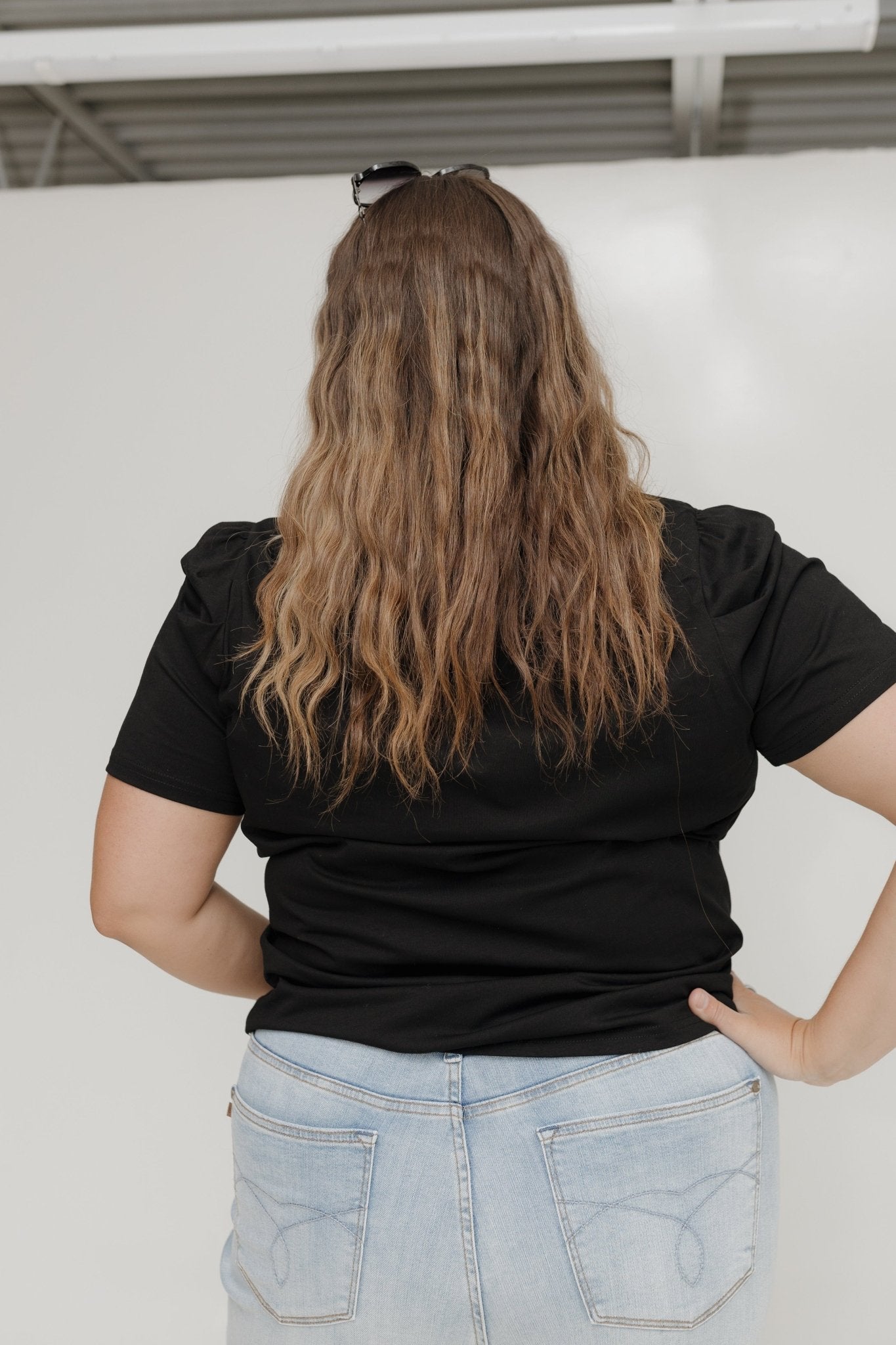Add a little glam to your graphic-free days with our Puff Sleeve Sparkly Tee—a soft, standout plus-size tee with subtle sparkle and a whole lot of attitude. Featuring puff sleeves, a classic crew neck, and a shimmering neckline detail, this black cotton top brings just the right amount of edge for your next night out or country concert.
