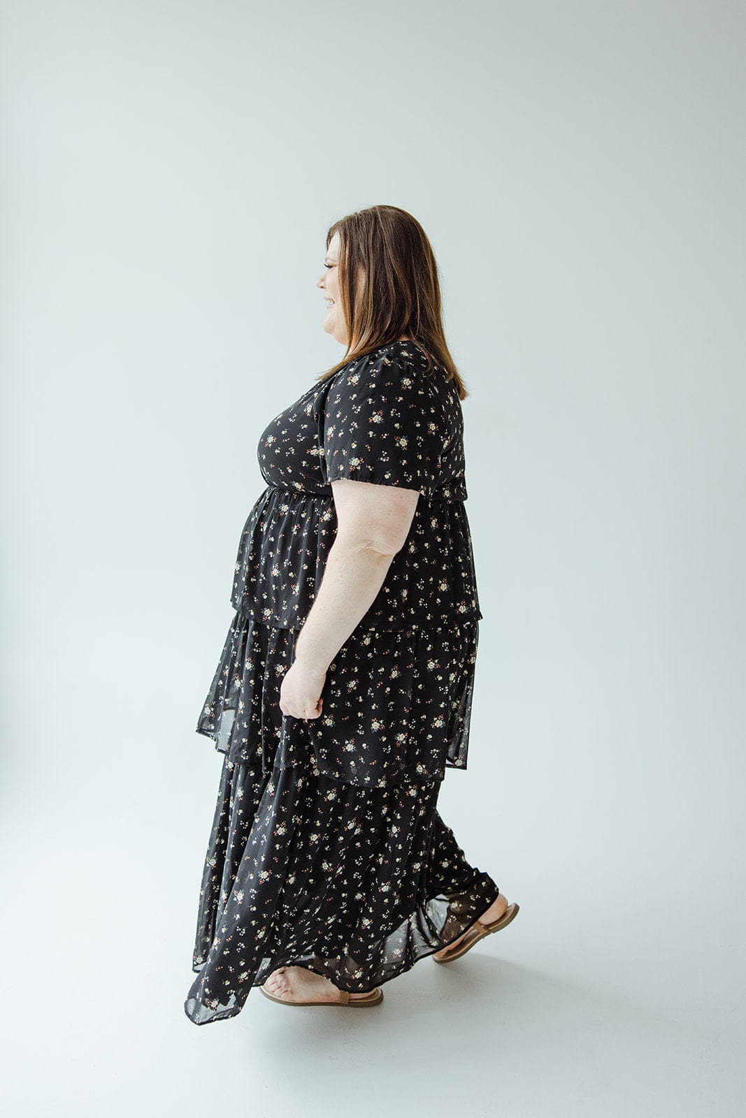 Flaunt your bohemian mid to plus-size style with our BOHO LAYERED RUFFLE DRESS. Featuring flutter sleeves and a modest v-neck, this midi-length dress is perfect for any occasion. The layered ruffled skirts add a playful touch to your look. Stay stylish and comfortable with this must-have dress! Fits true to size. We suggest going with your typical size. Stacey is wearing a size 2x. Want more information about the model? Visit our Lovely Models page.