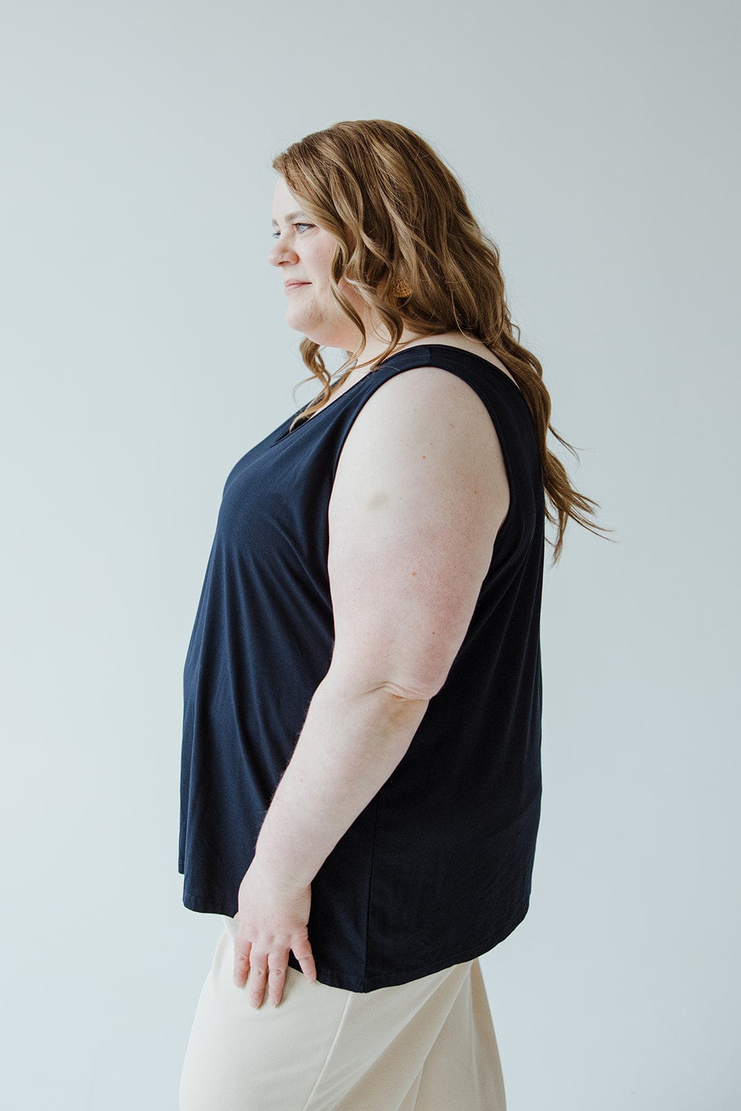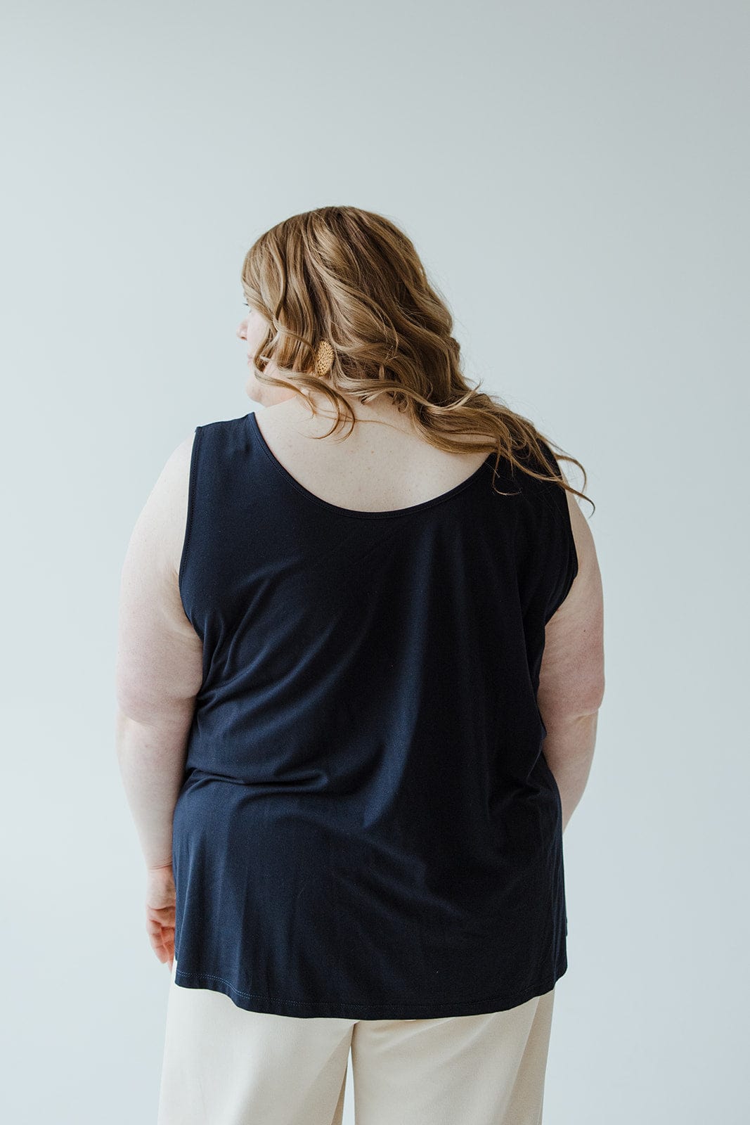 Simple, elegant, and oh-so-perfect! There is something wonderful about an excellent fitting black tank that is simple yet has that one detail (the reversible neckline) that takes it over the edge. This black tank is effortlessly versatile too! Pair it with a blazer and dress pants for work or your favorite activewear leggings for the days you need to be on the go! You'll love the choice of a v-neckline or rounded neckline. Also, you will enjoy the wide tank straps and the soft flowy fabric! The bamboo fabric is amazing! Enjoy all of the benefits of bamboo! Antibacterial, sweat absorbing, and temperature regulating. Fits true to size. Fits true to size. We suggest going with your typical size. Leslie is wearing a size 2x. Want more information about the model? Visit our Lovely Models page.