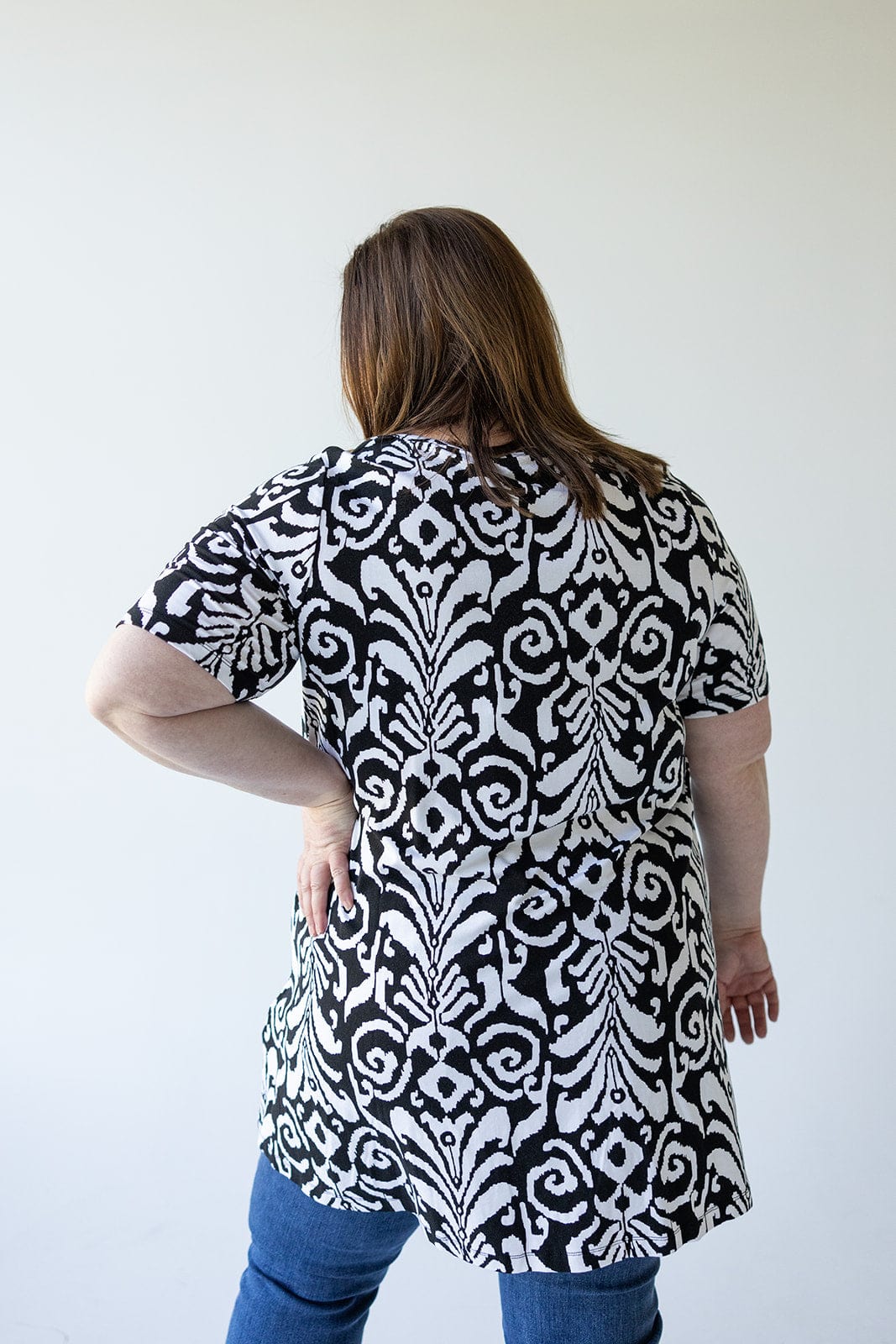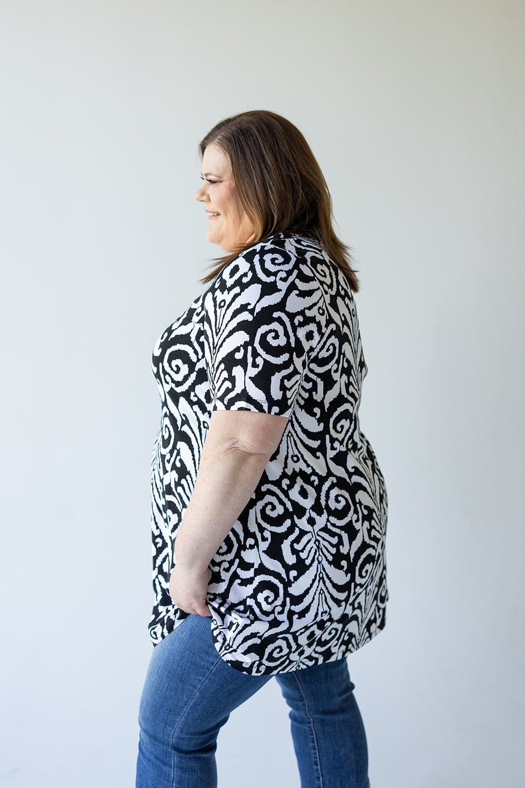 Introducing our V-Neck Tunic Tee in Abstract Print - the epitome of effortless style. Featuring a clean v-neckline for a flattering fit, and a tunic length for added sophistication and versatility. Elevate your wardrobe with ease and indulge in the luxury of this abstract print. Fits slightly generous. We suggest going a size down from your typical. Stacey is wearing a size 18. Want more information about the model? Visit our Lovely Models page.