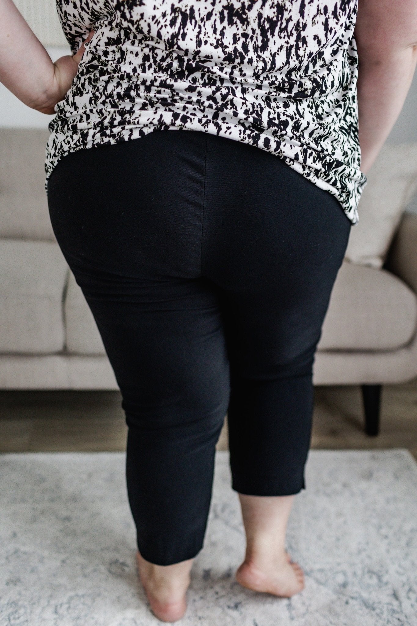 The CAPRI DRESS PANT IN BLACK is perfect for effortless and luxurious comfort. Crafted from a stretchy fabric blend, these capri leggings feature a wide and comfortable waistband and wing detail at the hemline. A perfect combination of style and comfort, these pants will be a staple in your wardrobe.