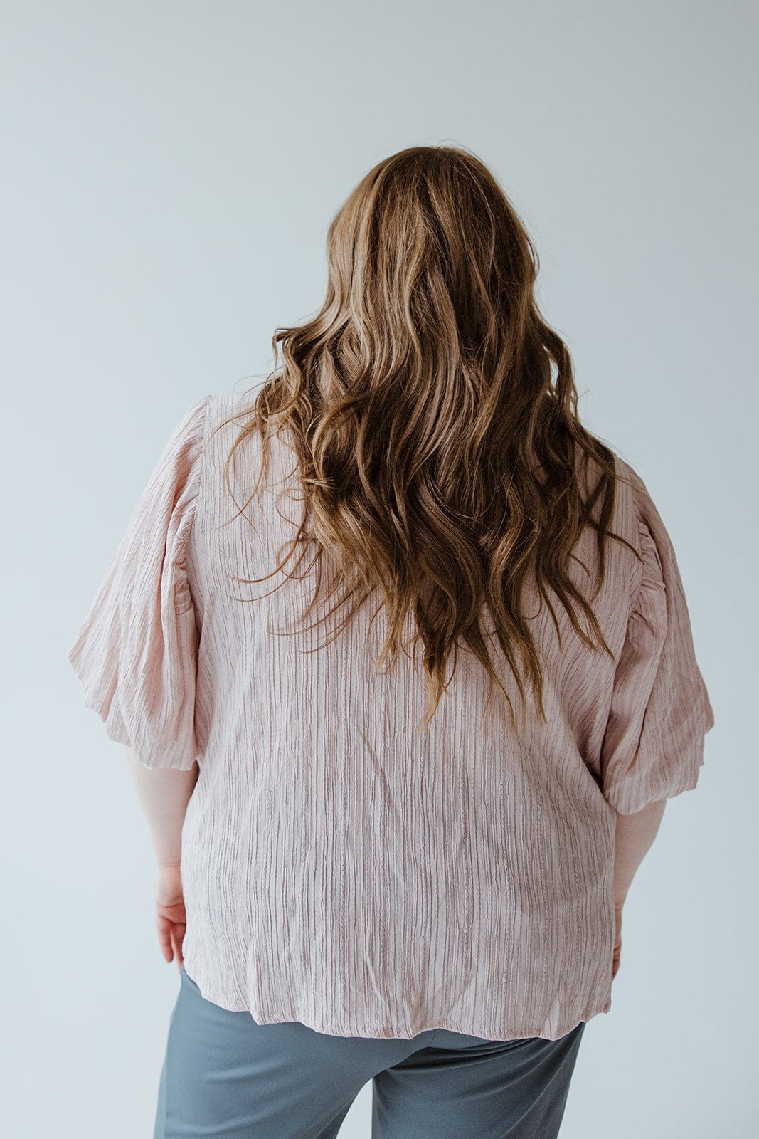 Get ready to turn heads with our TEXTURED LONG CROP BLOUSE! Featuring a round neck, keyhole back, and bubble sleeve, this blouse is made with textured chiffon for a chic and modern look. The long crop length is perfect for pairing with skirts or high-waisted pants. Available in Rosewater or Palisade Orchid. Fits slim. Leslie is wearing a size 4x. Want more information about the model? Visit our Lovely Models page.
