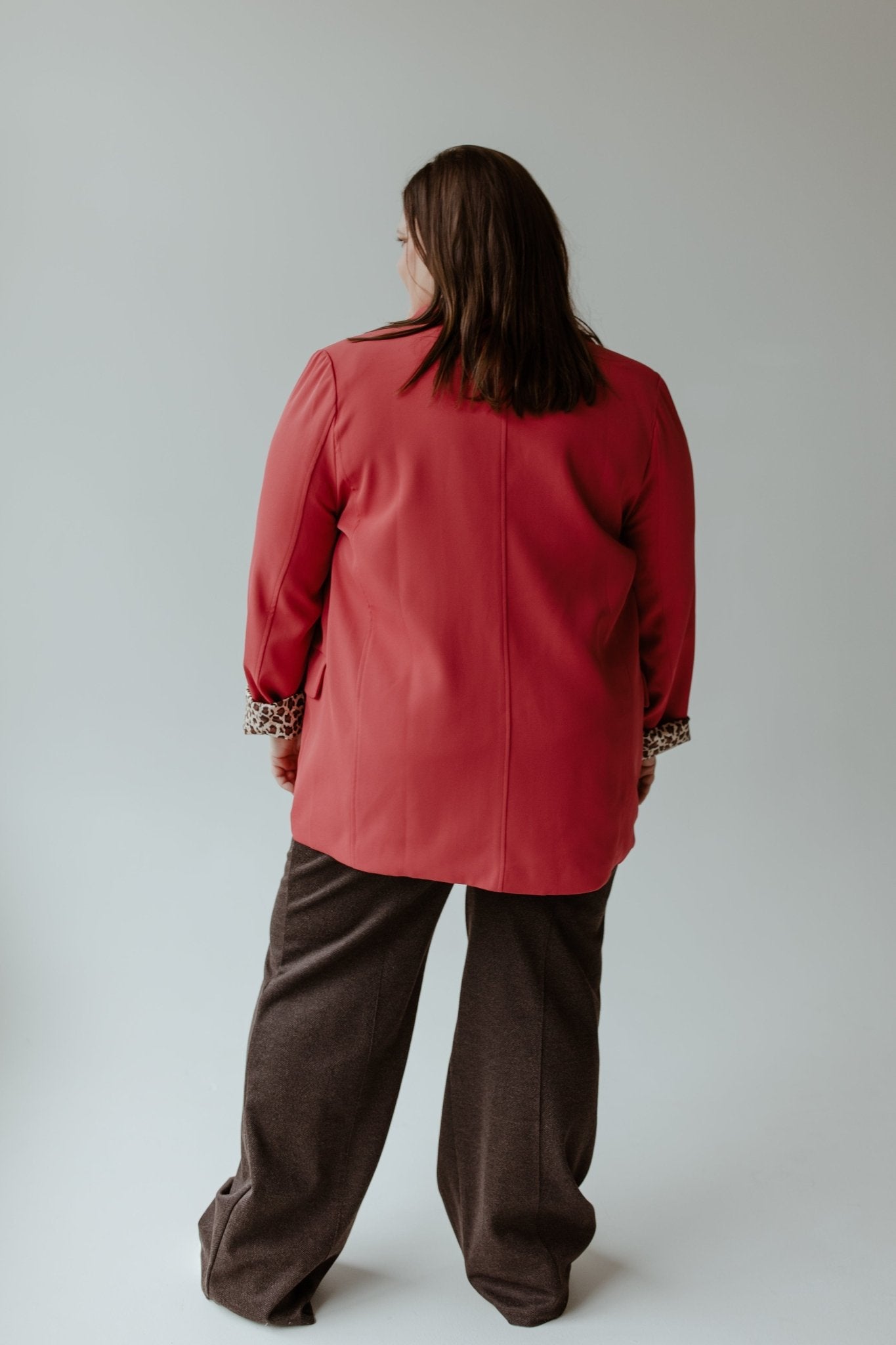 We all need a great-fitting boss babe blazer! This one fits the bill! The beautiful lipstick color adds a fun pop of color that can be paired with any of your favorite blouses and career pant combos, but our favorite is a great pair of distressed jeans and a tee for a casual Friday! This jacket features full-length sleeves, a thin lapel, pockets that can be tucked in or left out, and a longer length. Fits true to size, but has a little stretch in the arm and shoulders.