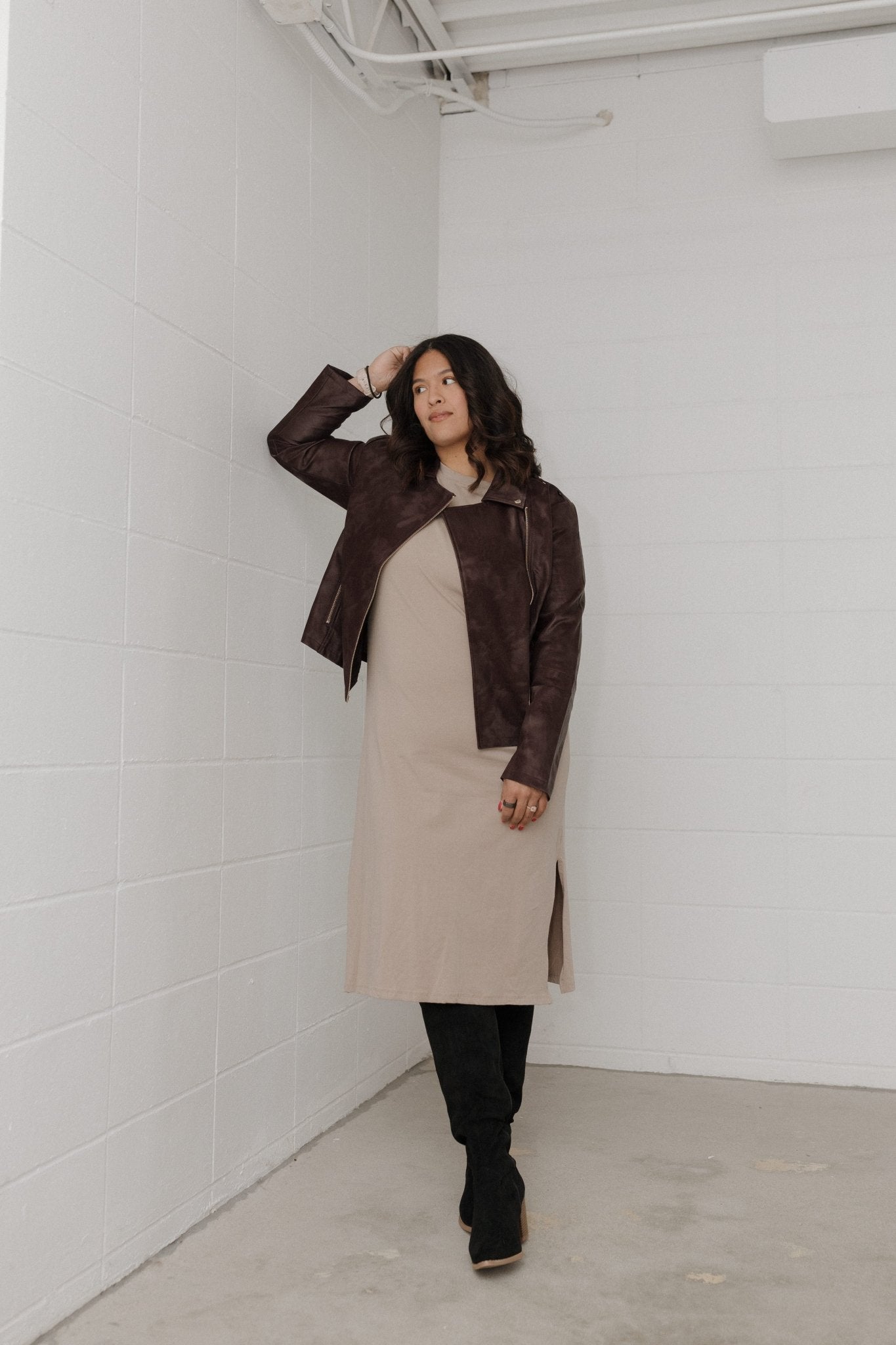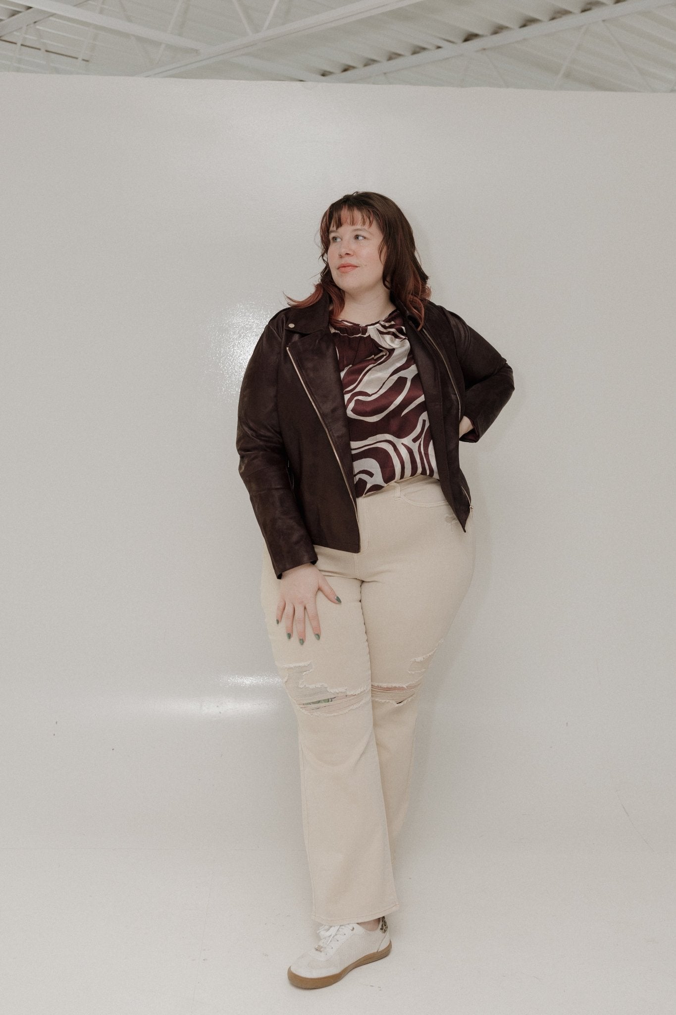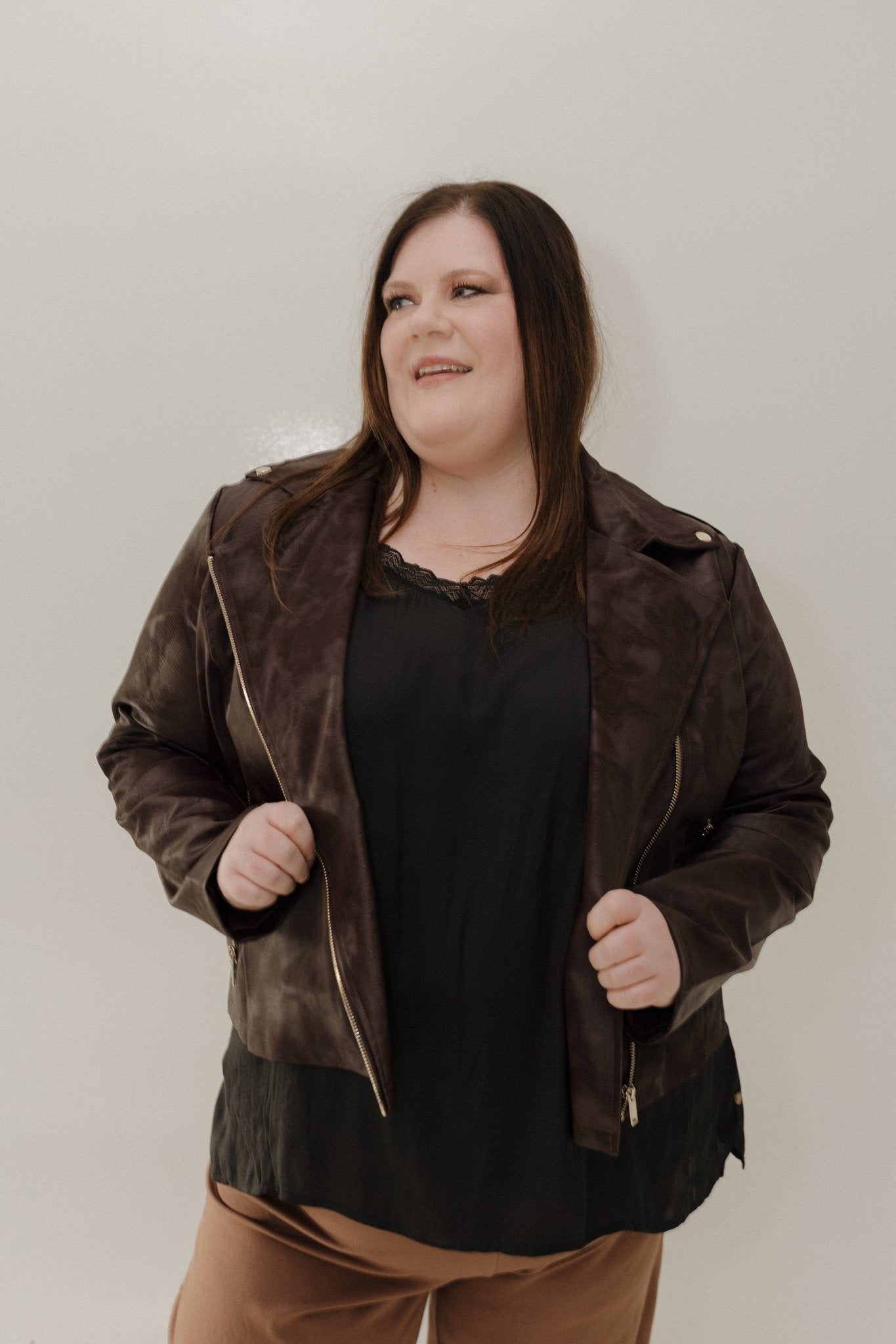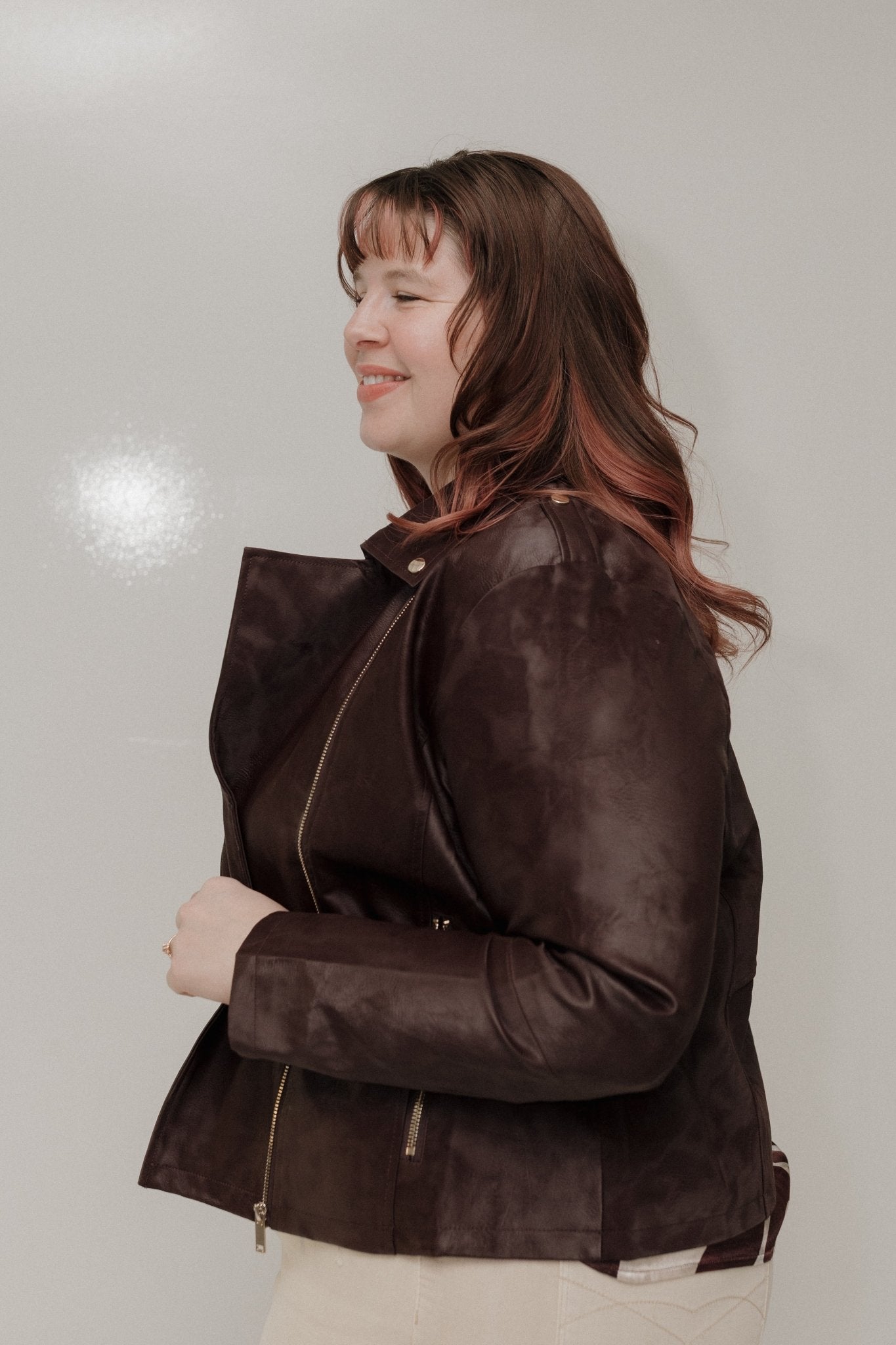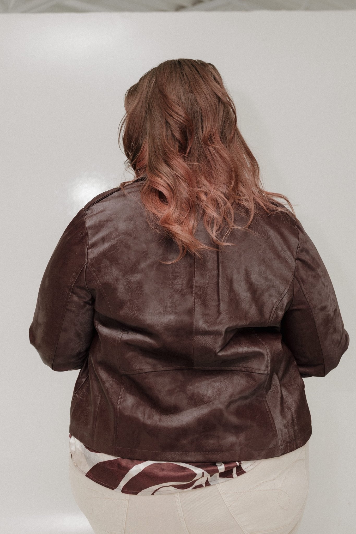 Make a bold, confident statement with the Rich Burgundy Faux Leather Moto Jacket, designed for the mid-size and plus-size woman who loves edgy style with a luxe twist. Crafted from a supple, easy-care faux leather, this jacket delivers elevated texture with comfortable, wearable structure.