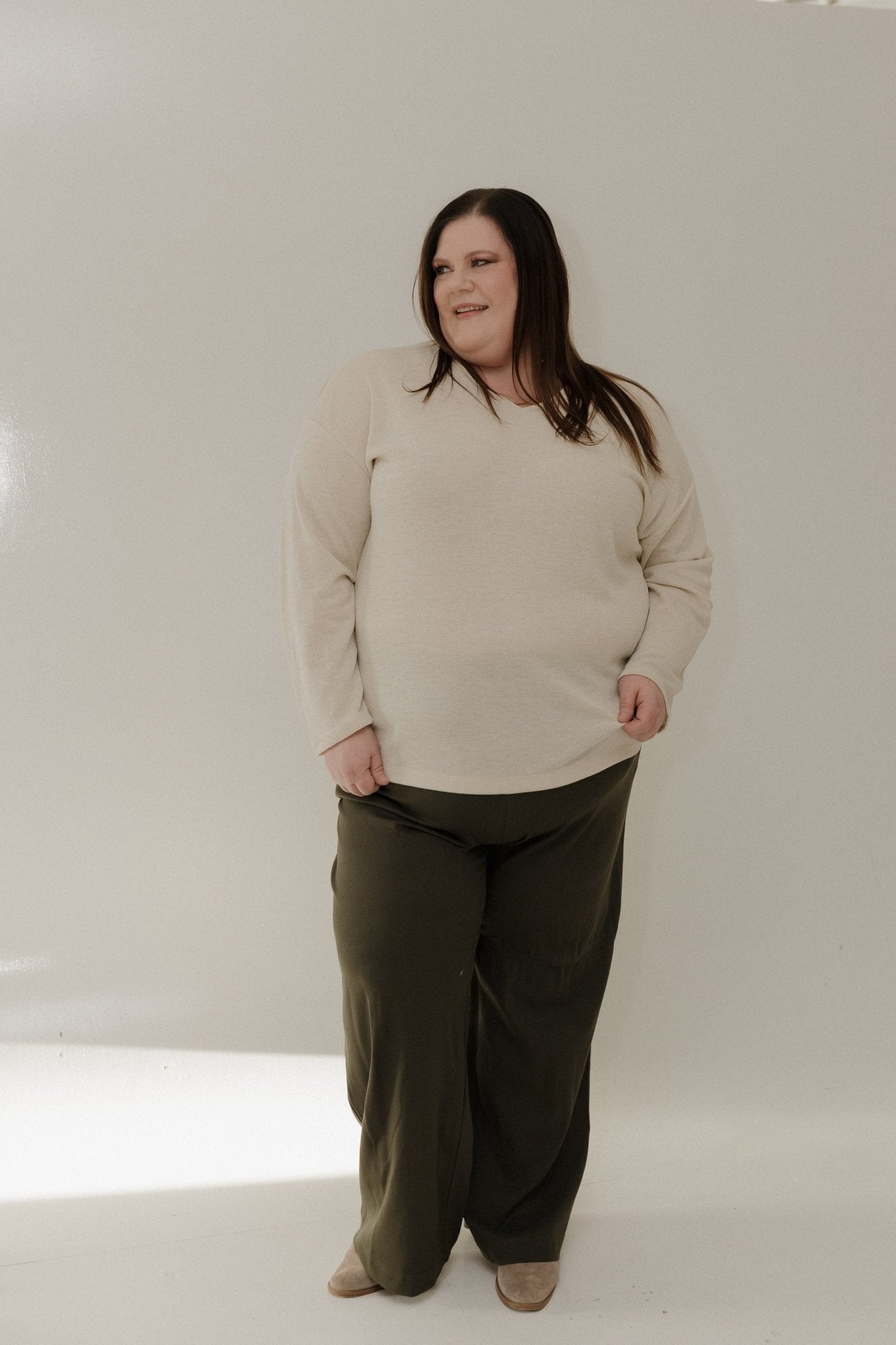 Add instant polish to your everyday wardrobe with the Shimmery Banded Hem Knit Top in Champagne. Designed for mid-size and plus-size women, this elevated knit top features a flattering V-neck, relaxed dolman sleeves, and a banded hem that creates a beautifully draped silhouette. The soft shimmer fabric catches the light just enough to feel luxe—without sacrificing comfort. Perfect for casual days, dinners out, or holiday-ready layering.