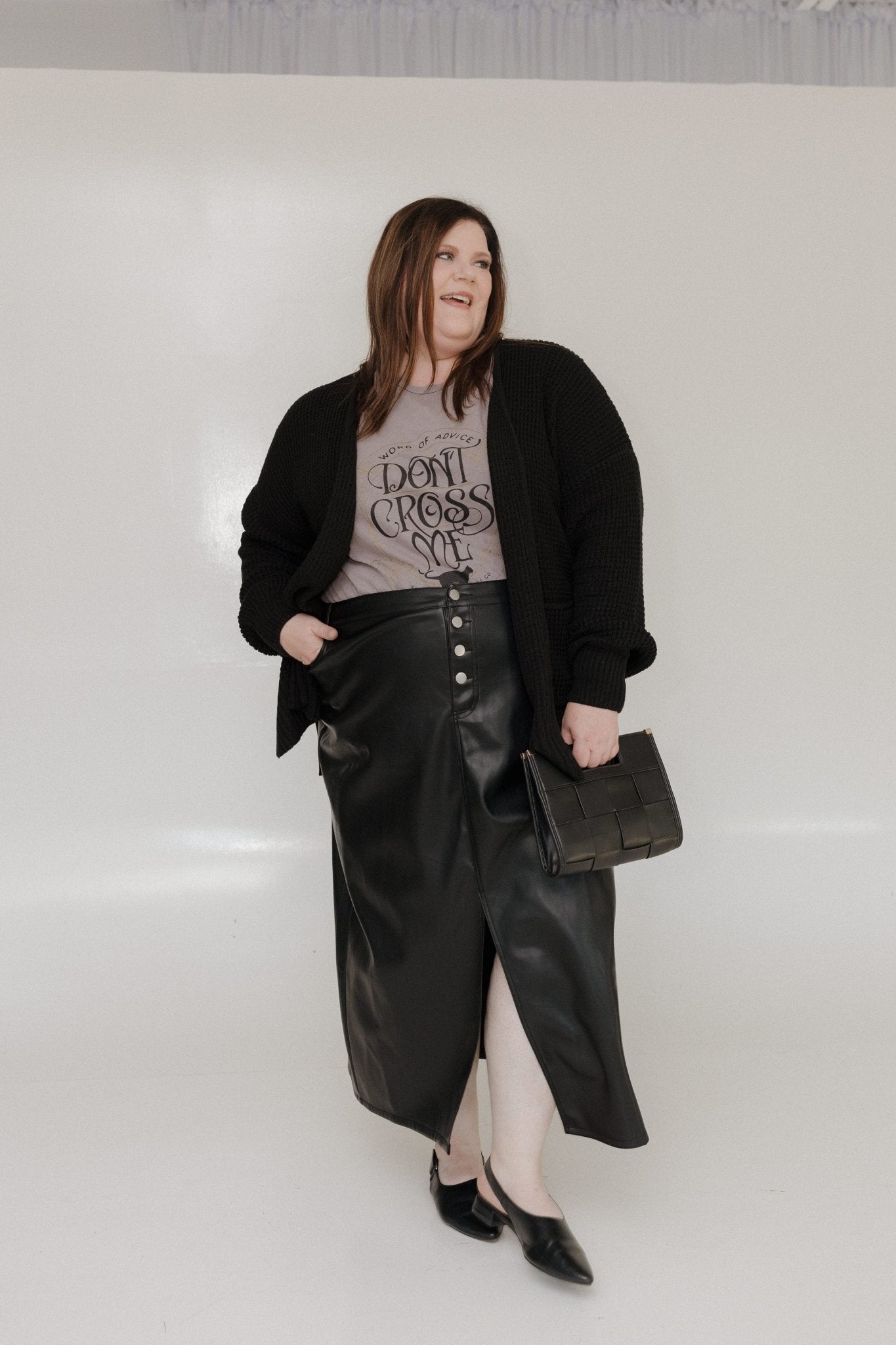 Meet your new power piece. The Faux Leather Maxi Skirt in Black is designed to turn heads while staying timeless and wearable. Crafted from a luxe faux leather blend with a smooth, polished finish, this skirt delivers just the right amount of edge with a sophisticated silhouette you’ll reach for again and again.