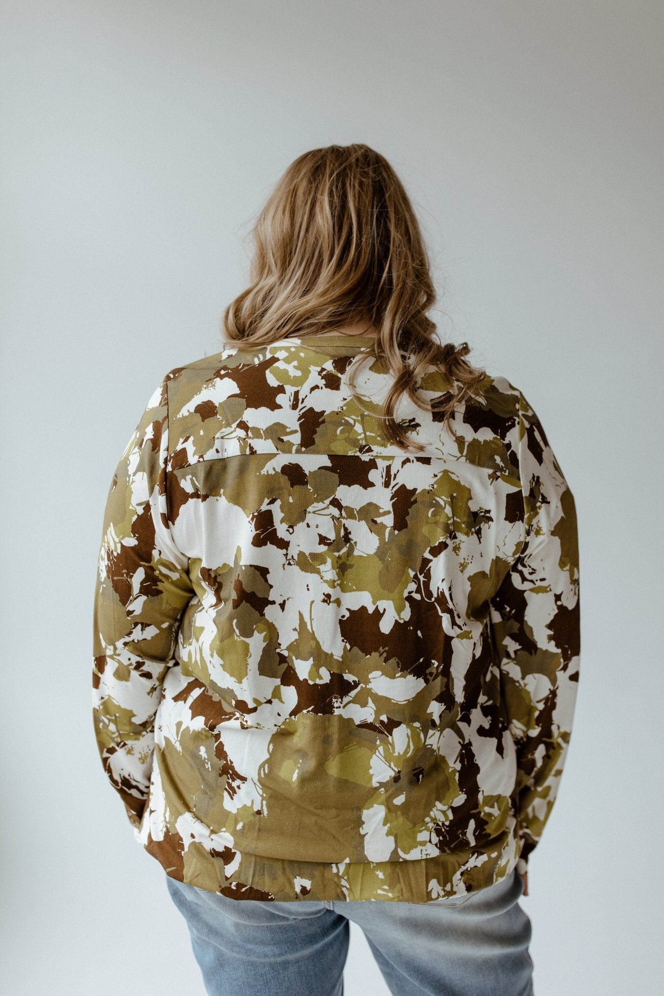 Elevate your wardrobe with our Large Abstract Floral Print Blouse. This luxurious, long-sleeved knit blouse boasts a mandarin collar and elastic hemline, creating a flattering silhouette that can be adjusted to your liking. Made from a luscious jersey fabric, it offers both comfort and sophistication, perfect for any professional setting. Fits true to size. We suggest staying with your typical size. Leslie is wearing a size 16. Want more information about the model? Visit our Lovely Models page.