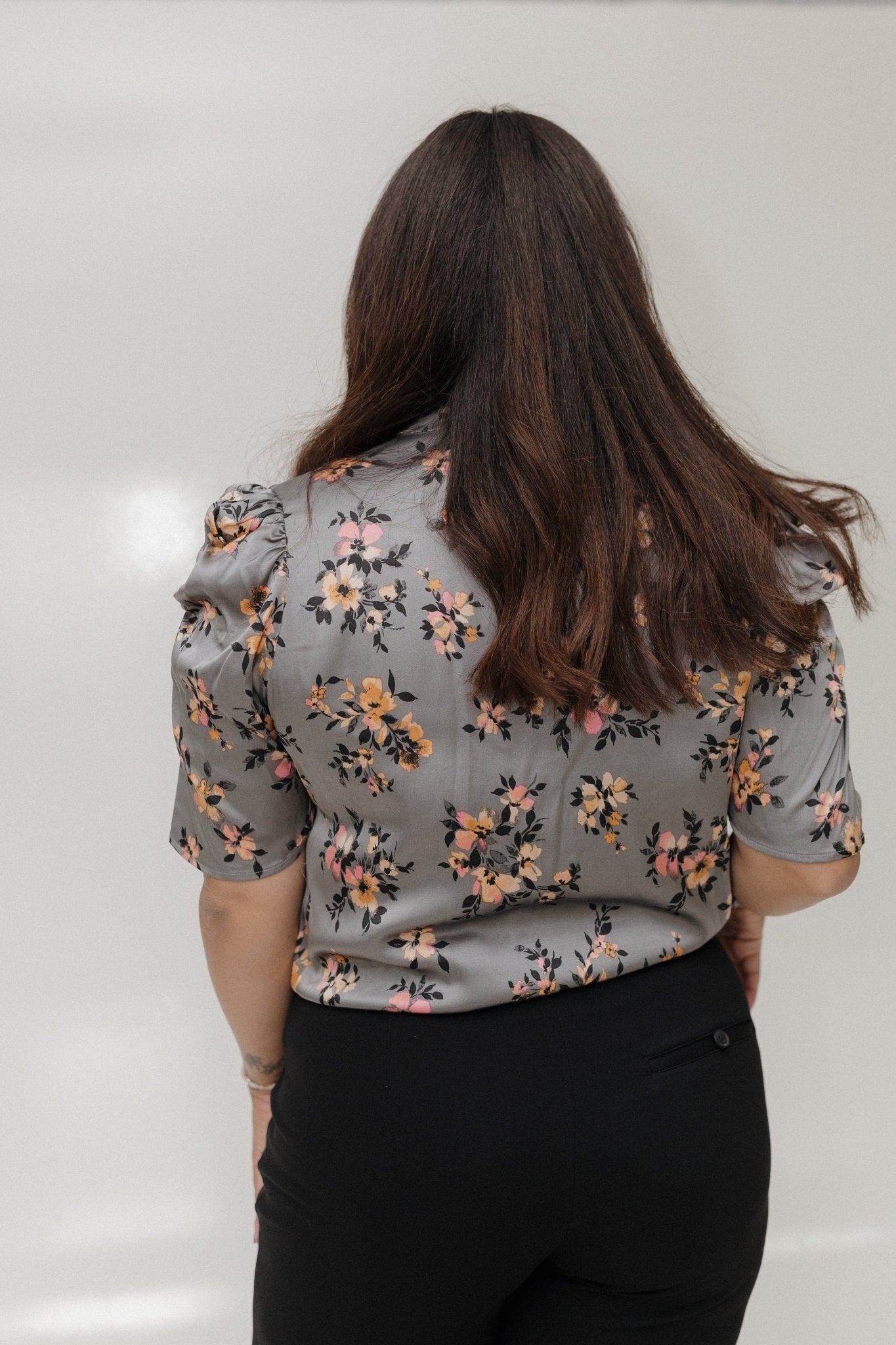 PUFF SHOULDER SILKY BUTTON-UP FLORAL BLOUSE IN CHARCOAL