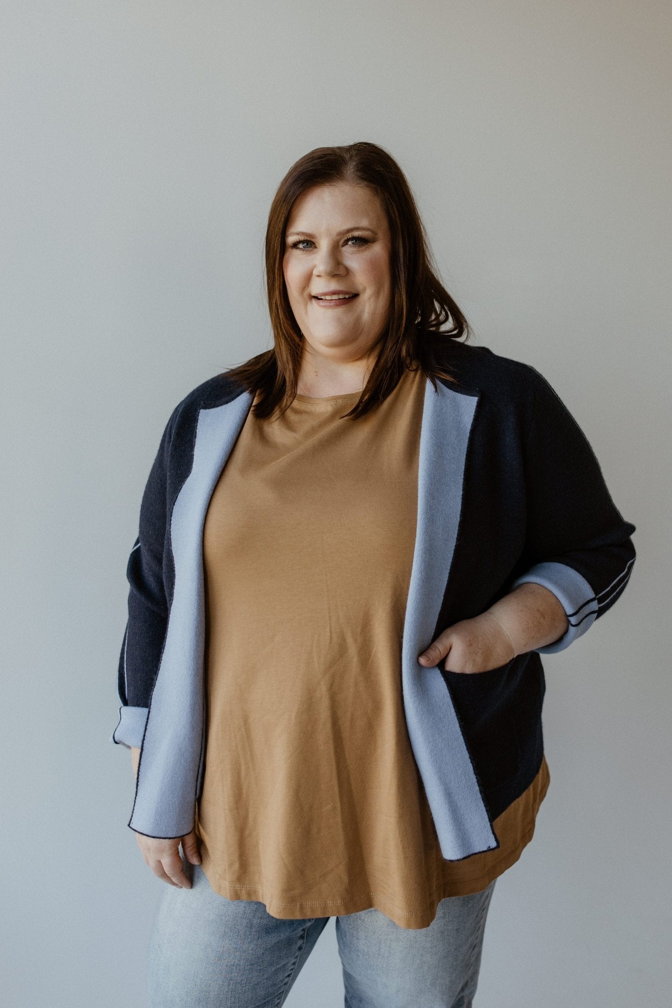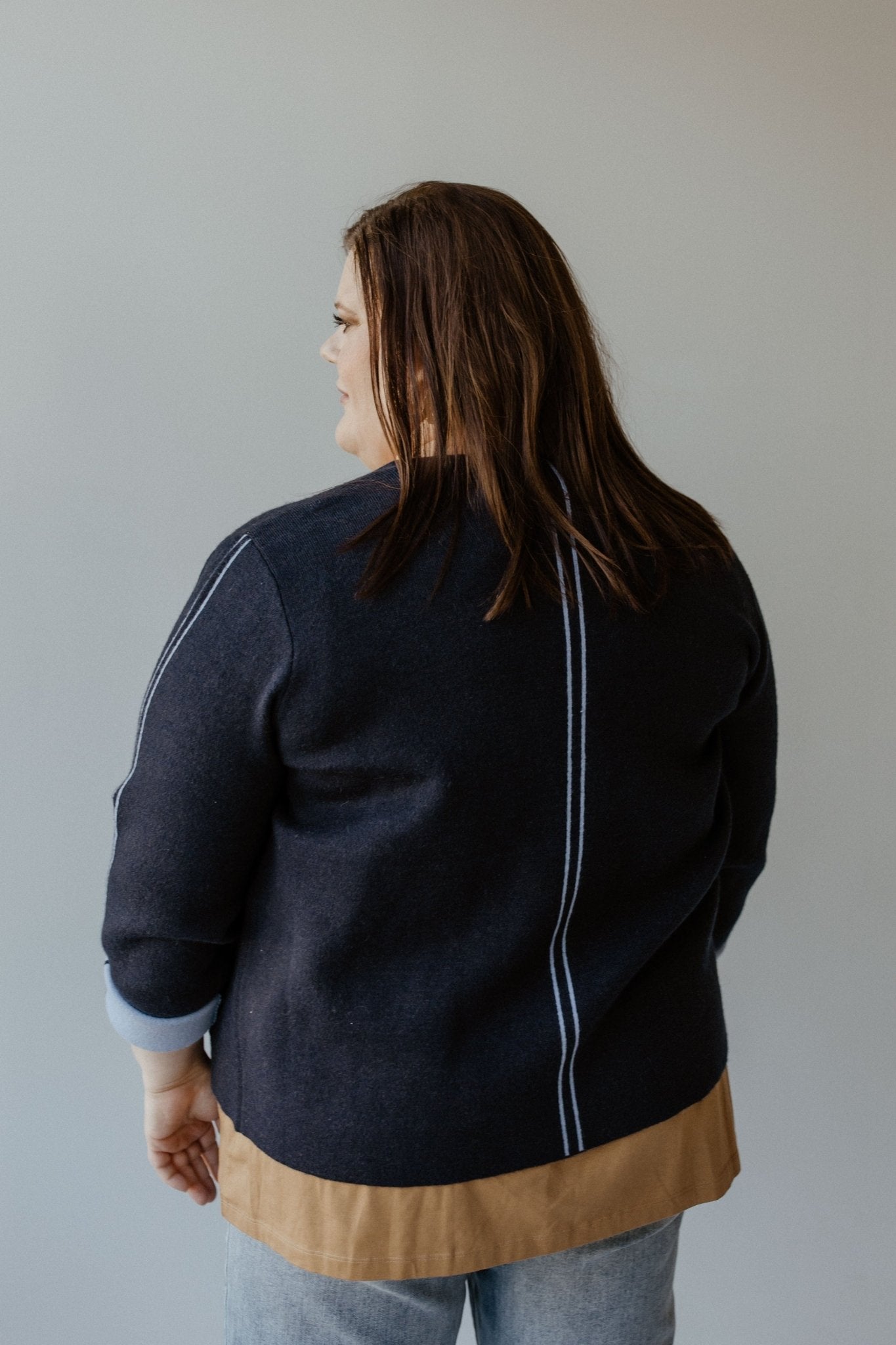 Crafted with sophistication and attention to detail, this STRIPE DETAIL CARDIGAN is the perfect addition to your wardrobe. Featuring a classic silhouette and collarless design, it's finished with light blue stripes running down the shoulder and back for a timelessly stylish look. Knitted for superior comfort and quality, this cardigan is the perfect combination of elegance and luxury. Fits true to size. We suggest going with your typical size.  is wearing a size 16. Want more information about the model? Visit our Lovely Models page.